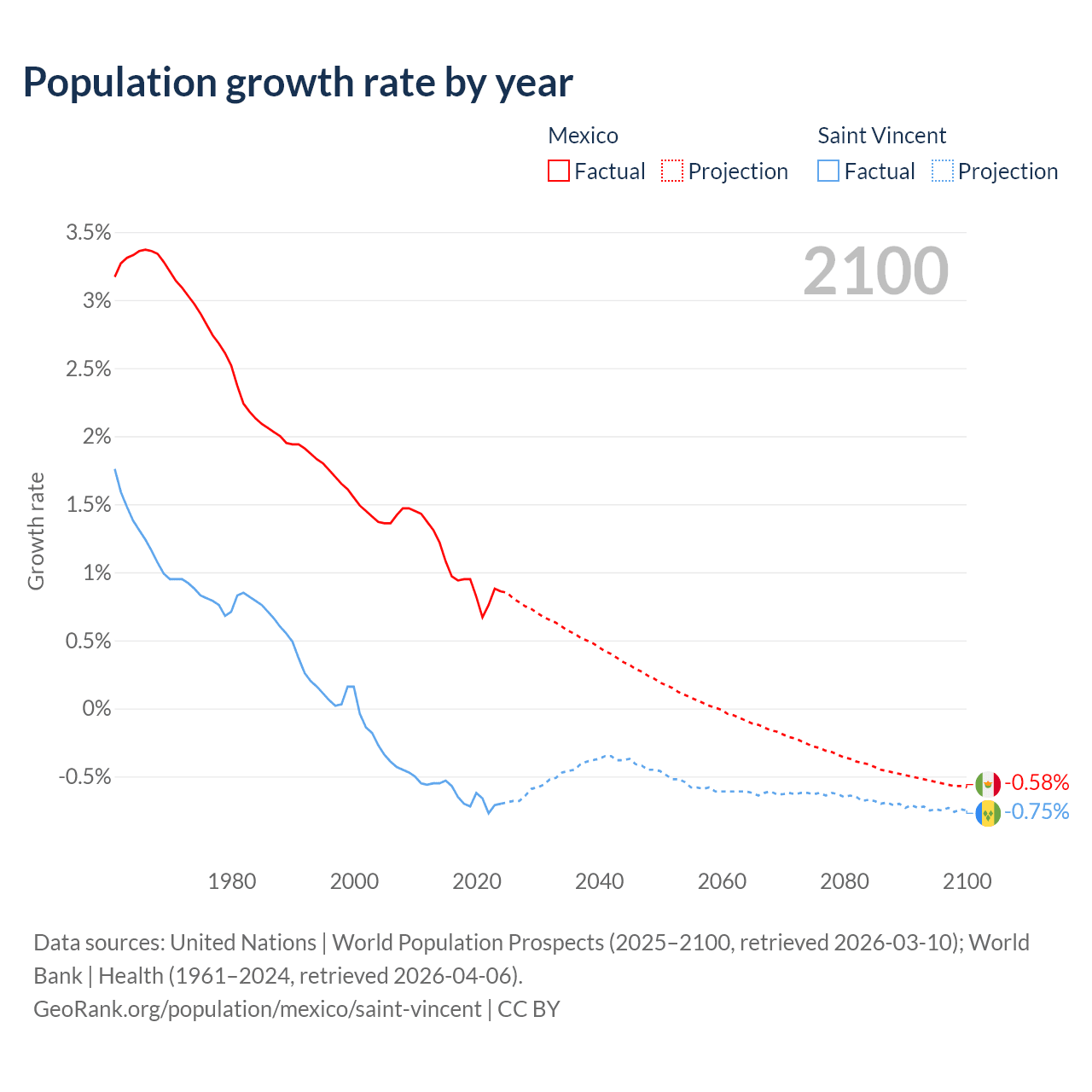 - For the last 10 years, Mexico has had an average growth rate of +0.92% per year vs -0.65% in Saint Vincent.