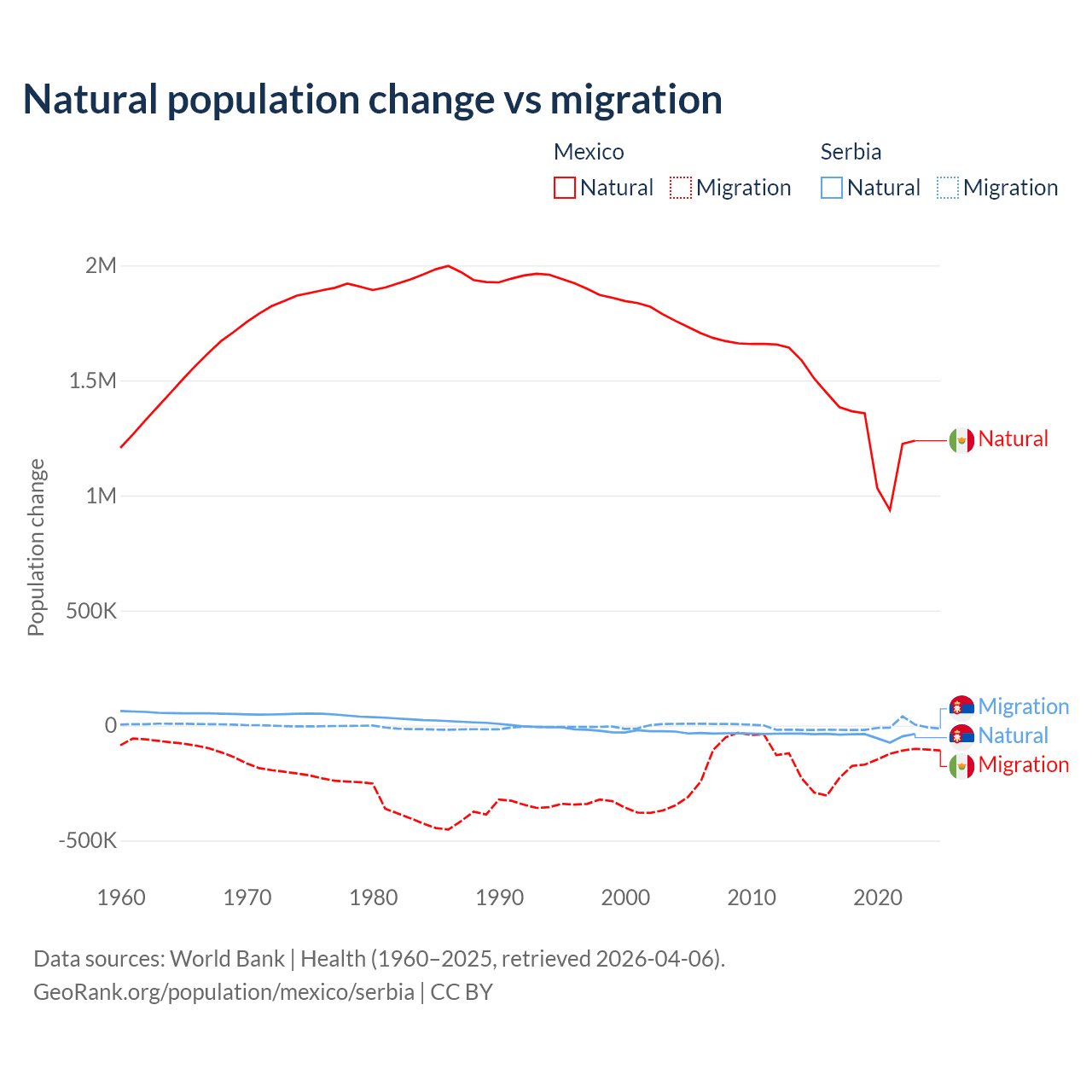 Over the last 10 years, 87.5% of the population change in Mexico is from natural causes (a gain of 13,080,136 people) and 12.5% is from migration (a loss of 1,876,544 people). In Serbia 83.3% is from natural causes (a loss of 435,148 people) and 16.7% is from migration (a loss of 87,110 people).