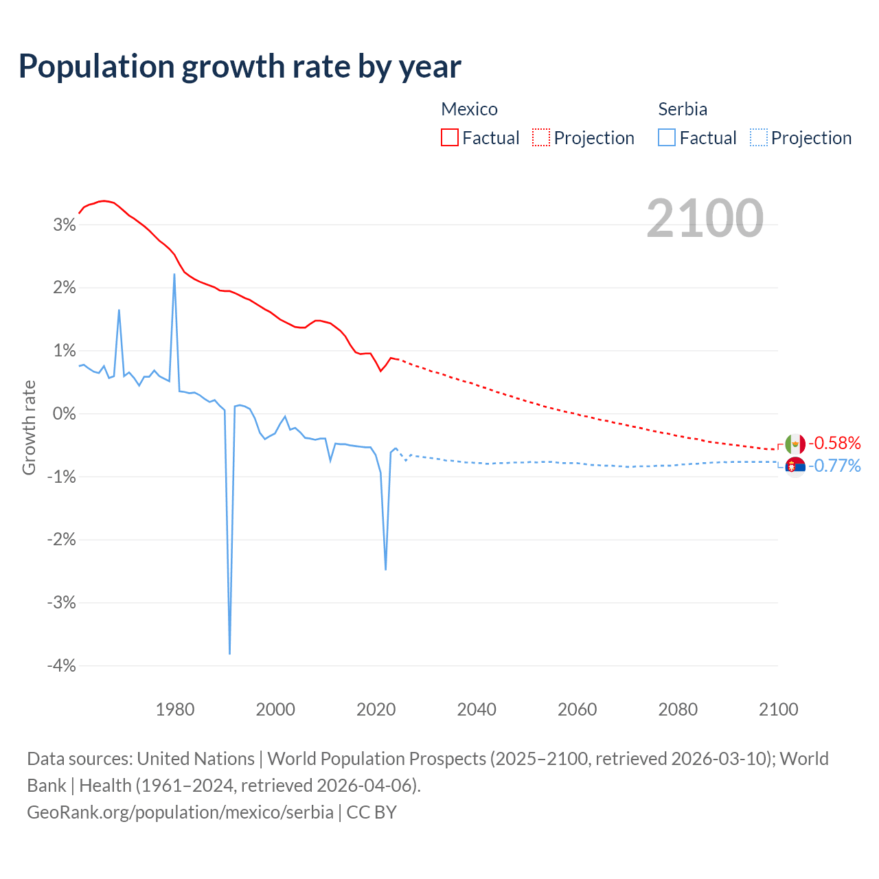 - For the last 10 years, Mexico has had an average growth rate of +0.92% per year vs -0.76% in Serbia.