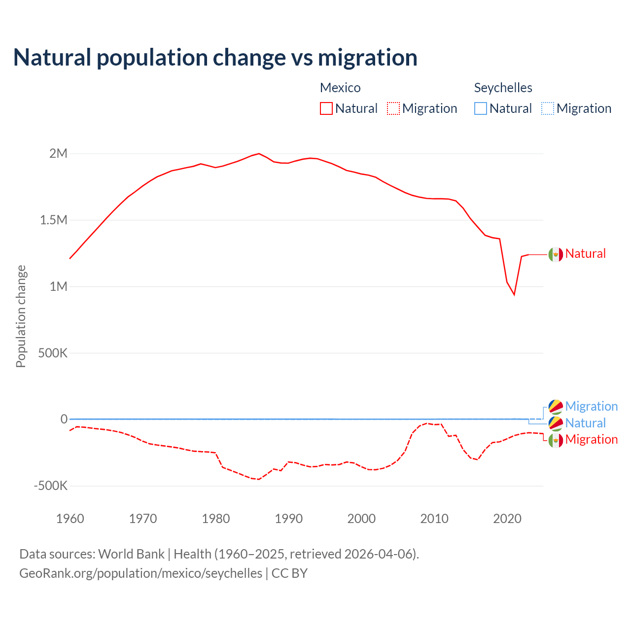 Over the last 10 years, 87.5% of the population change in Mexico is from natural causes (a gain of 13,080,136 people) and 12.5% is from migration (a loss of 1,876,544 people). In the Seychelles 31.4% is from natural causes (a gain of 8,122 people) and 68.6% is from migration (a gain of 17,748 people).