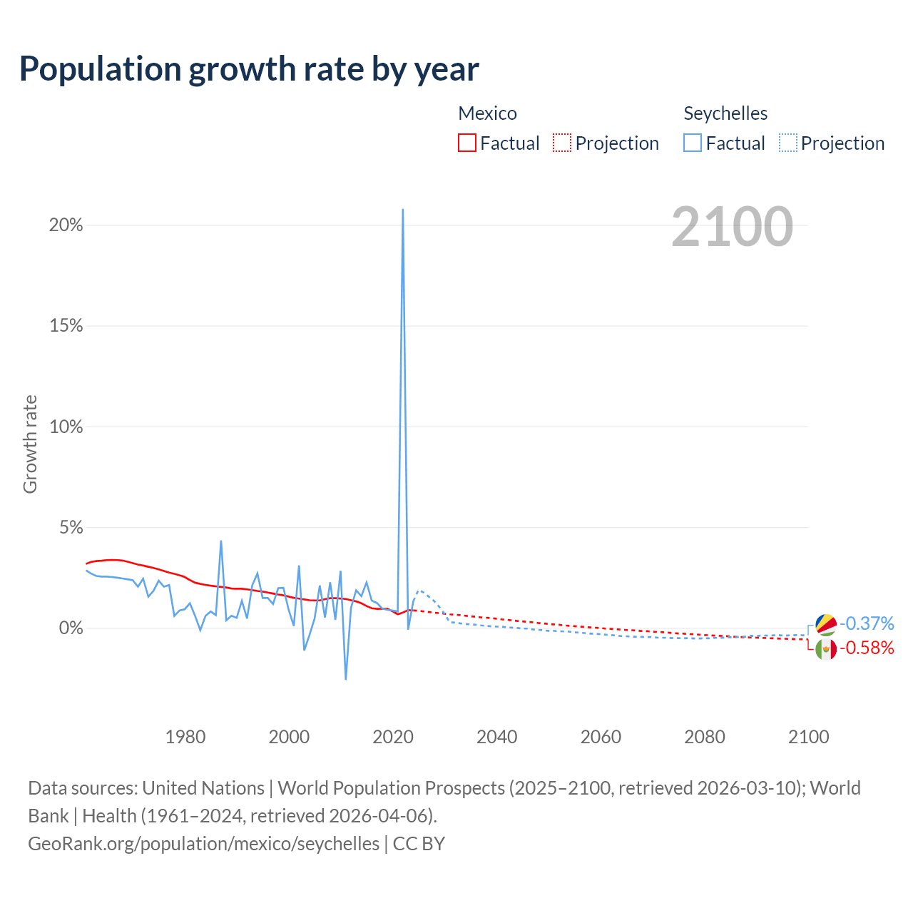 - For the last 10 years, Mexico has had an average growth rate of +0.92% per year vs +2.9% in the Seychelles.