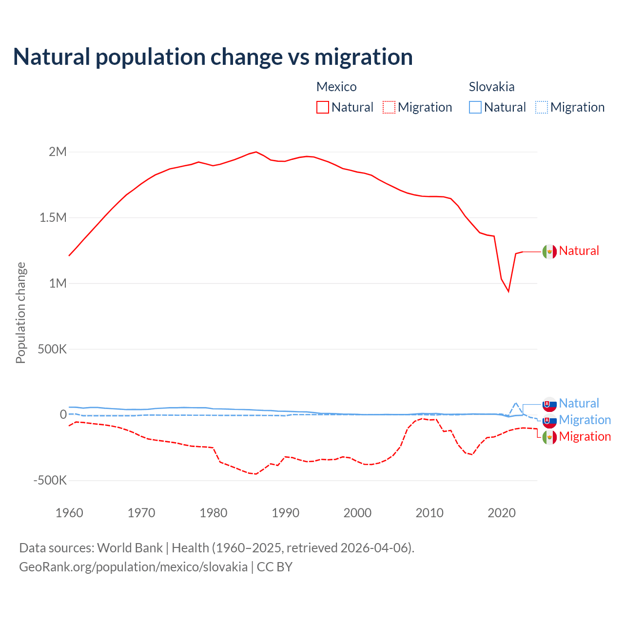 Over the last 10 years, 87.5% of the population change in Mexico is from natural causes (a gain of 13,080,136 people) and 12.5% is from migration (a loss of 1,876,544 people). In Slovakia 7.47% is from natural causes (a loss of 8,728 people) and 92.5% is from migration (a gain of 108,156 people).