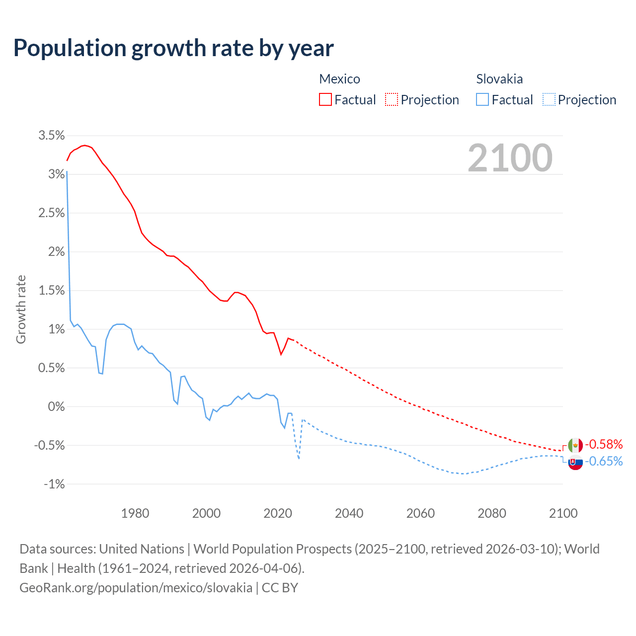 - For the last 10 years, Mexico has had an average growth rate of +0.92% per year vs +0.01% in Slovakia.