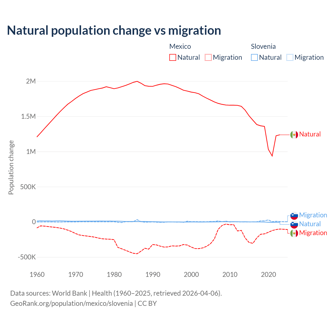 Over the last 10 years, 87.5% of the population change in Mexico is from natural causes (a gain of 13,080,136 people) and 12.5% is from migration (a loss of 1,876,544 people). In Slovenia 18.1% is from natural causes (a loss of 17,573 people) and 81.9% is from migration (a gain of 79,532 people).