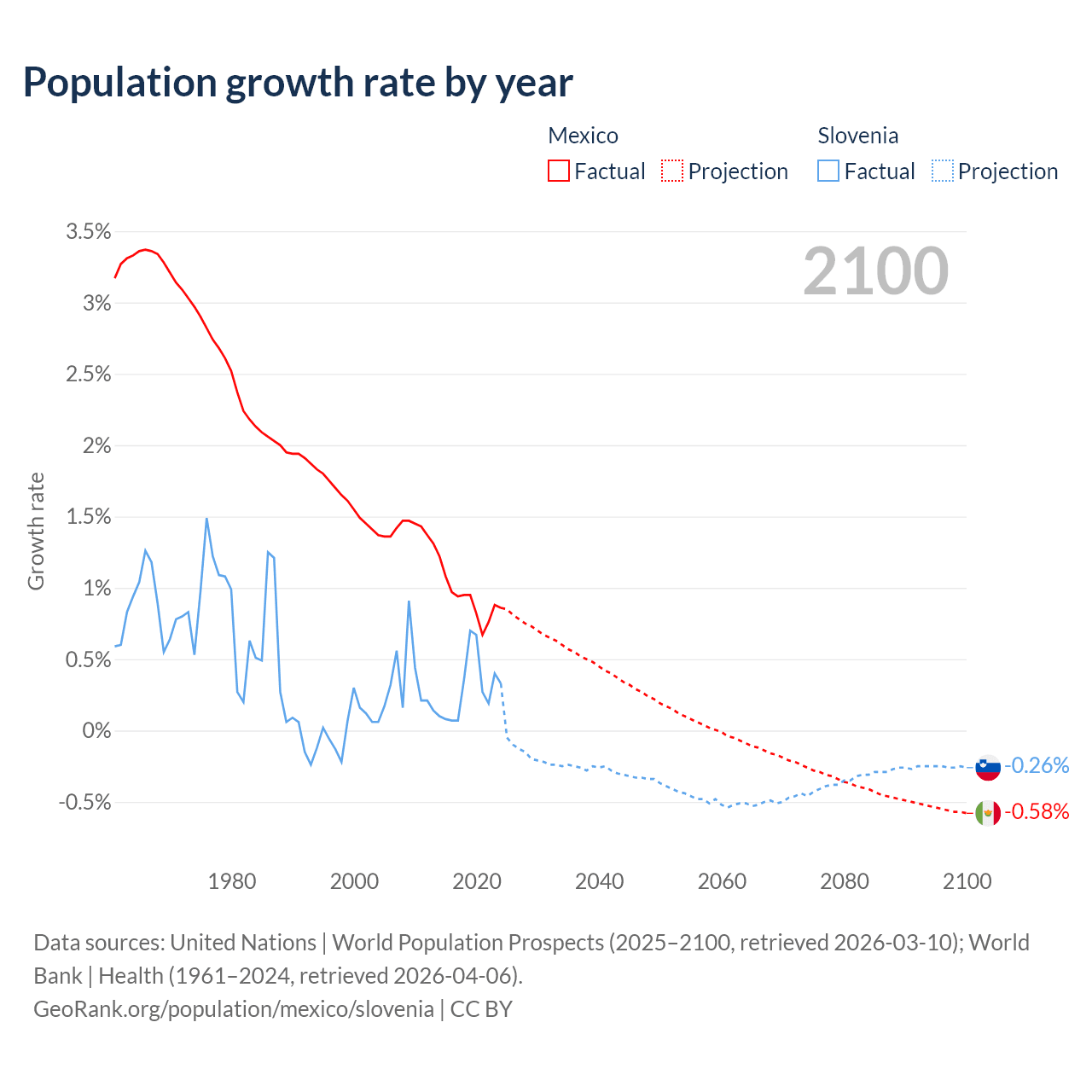 - For the last 10 years, Mexico has had an average growth rate of +0.92% per year vs +0.29% in Slovenia.