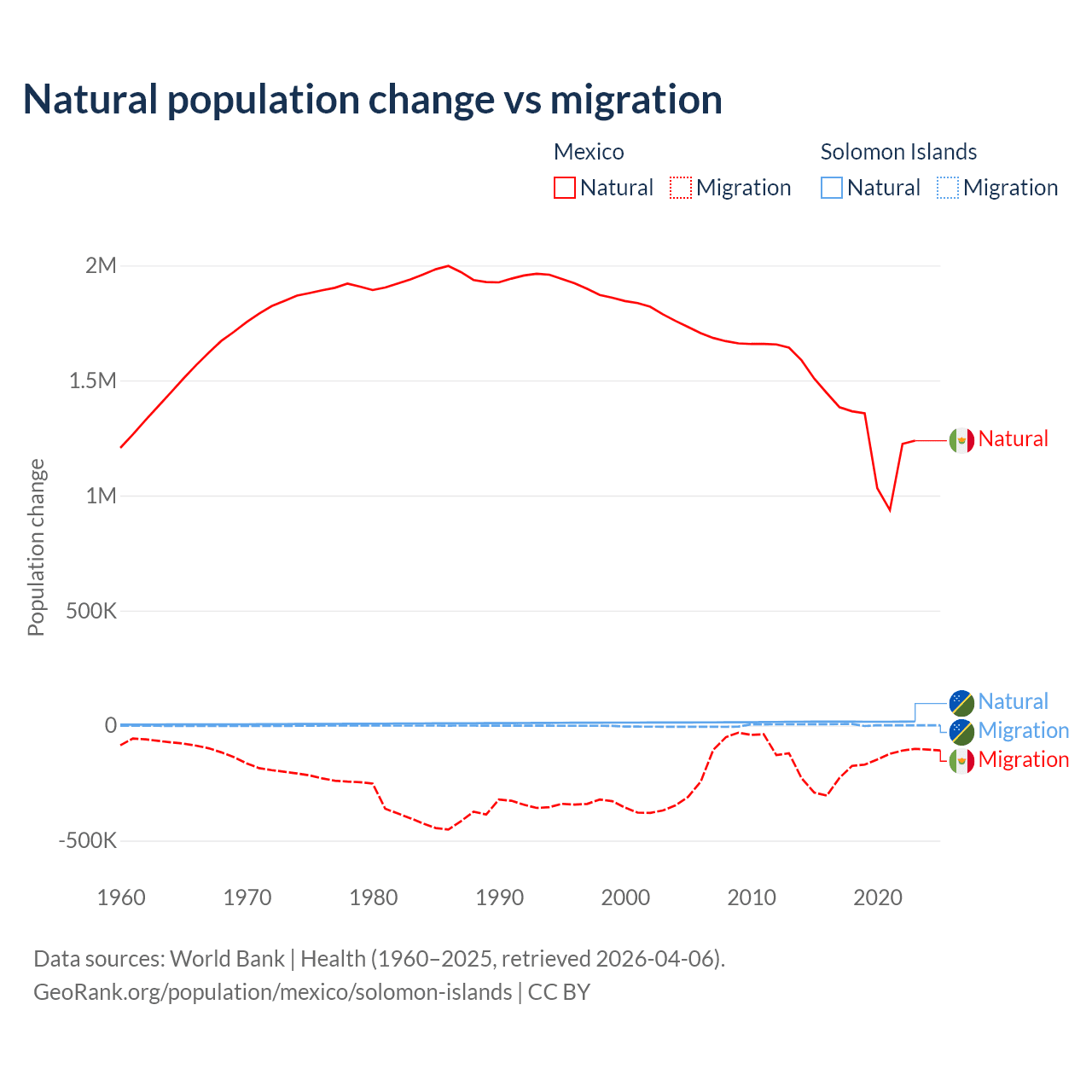 Over the last 10 years, 87.5% of the population change in Mexico is from natural causes (a gain of 13,080,136 people) and 12.5% is from migration (a loss of 1,876,544 people). In the Solomon Islands 82.8% is from natural causes (a gain of 168,727 people) and 17.2% is from migration (a gain of 35,031 people).