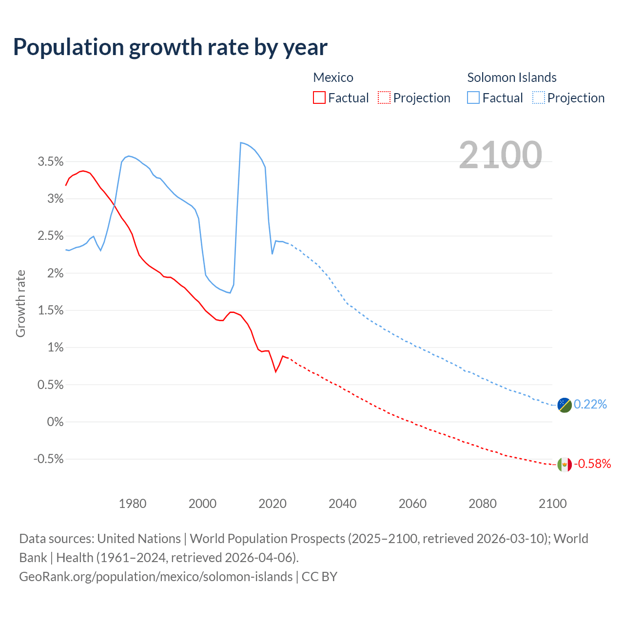 - For the last 10 years, Mexico has had an average growth rate of +0.92% per year vs +2.95% in the Solomon Islands.