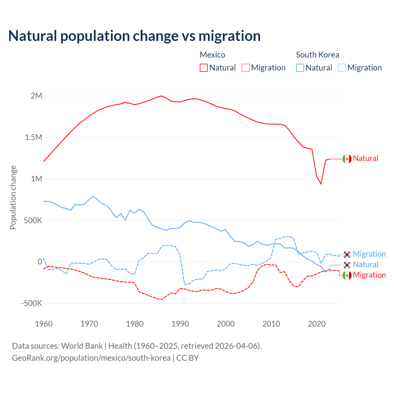 Over the last 10 years, 87.5% of the population change in Mexico is from natural causes (a gain of 13,080,136 people) and 12.5% is from migration (a loss of 1,876,544 people). In South Korea 17.6% is from natural causes (a gain of 277,215 people) and 82.4% is from migration (a gain of 1,298,356 people).