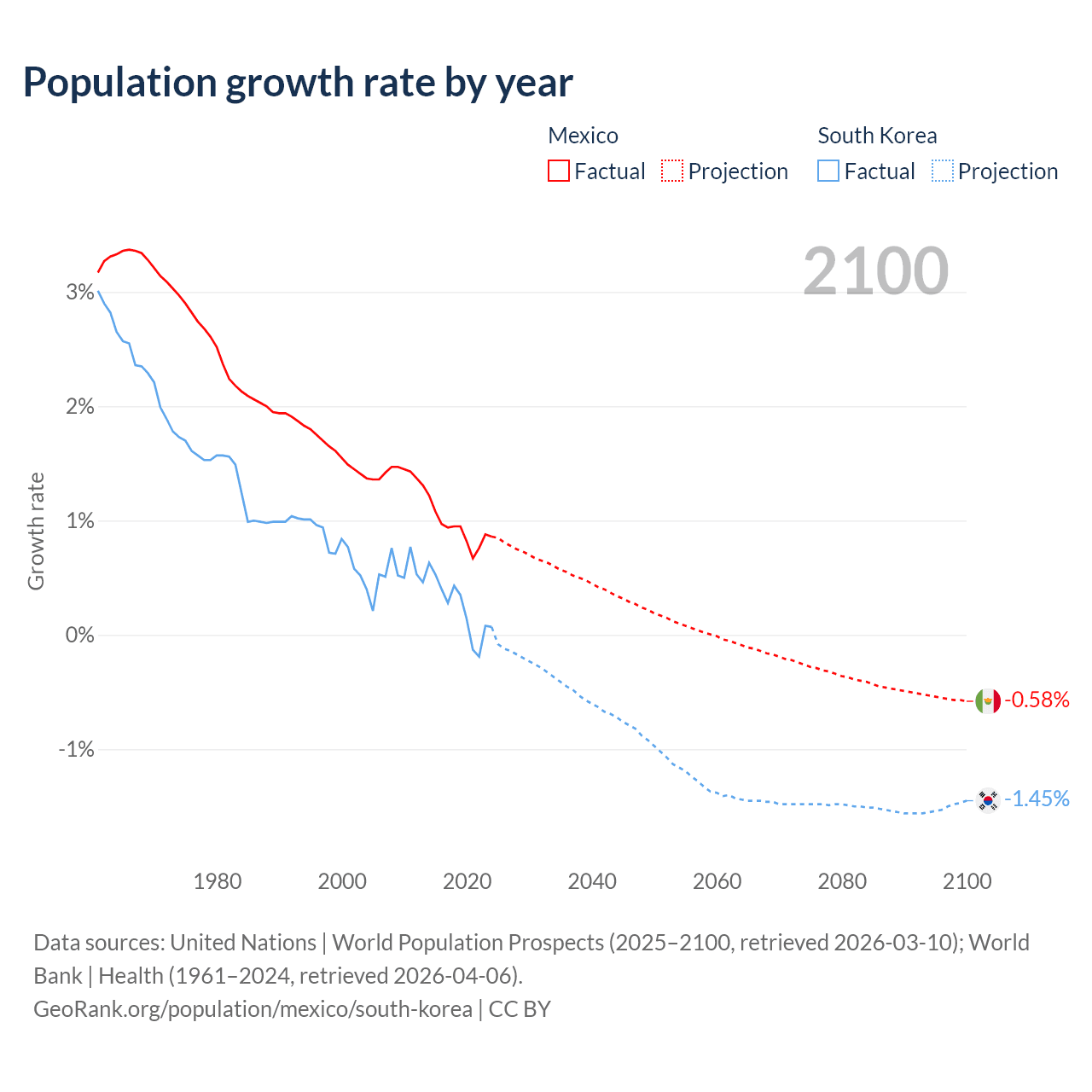 - For the last 10 years, Mexico has had an average growth rate of +0.92% per year vs +0.24% in South Korea.