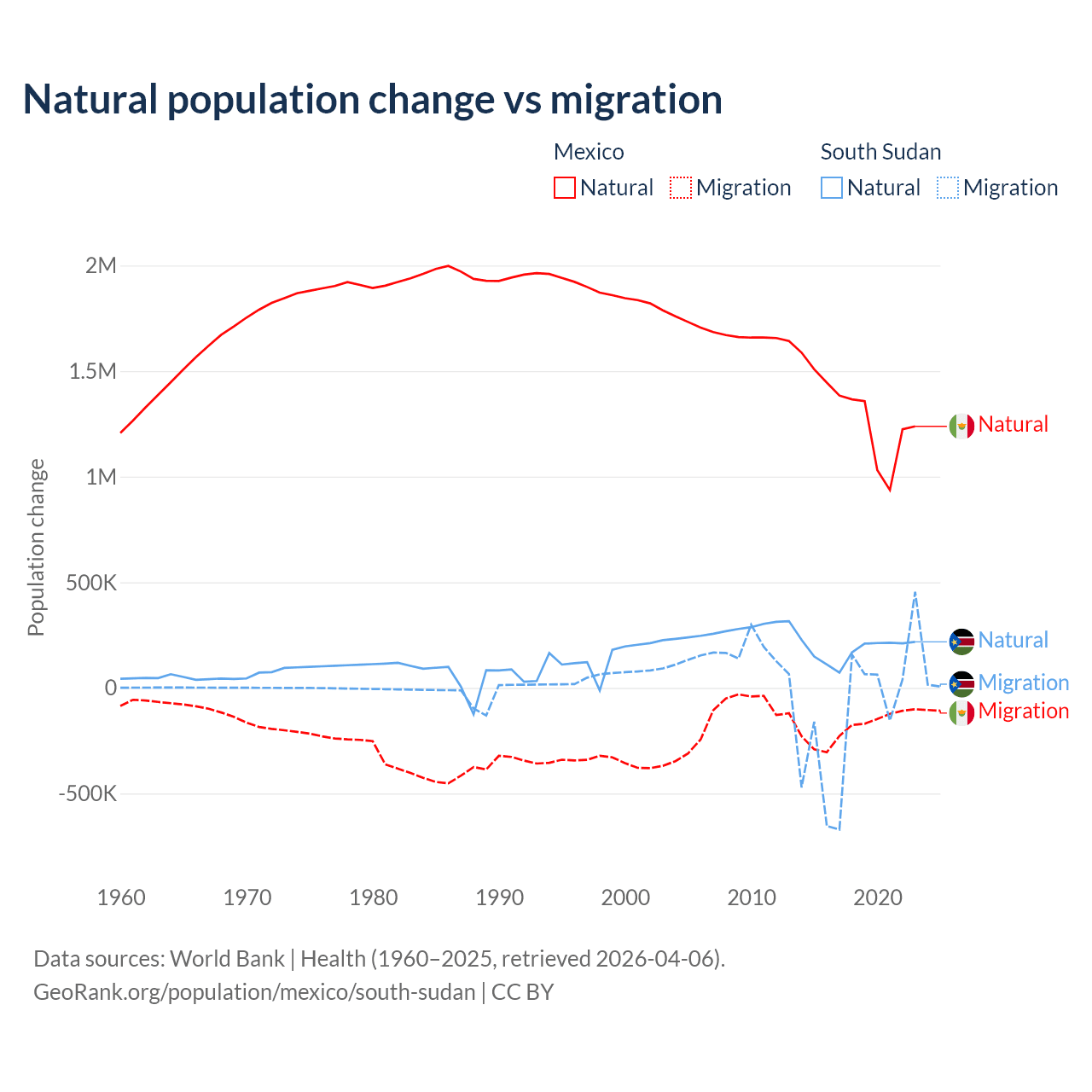 Over the last 10 years, 87.5% of the population change in Mexico is from natural causes (a gain of 13,080,136 people) and 12.5% is from migration (a loss of 1,876,544 people). In South Sudan 57.4% is from natural causes (a gain of 1,792,135 people) and 42.6% is from migration (a loss of 1,329,606 people).