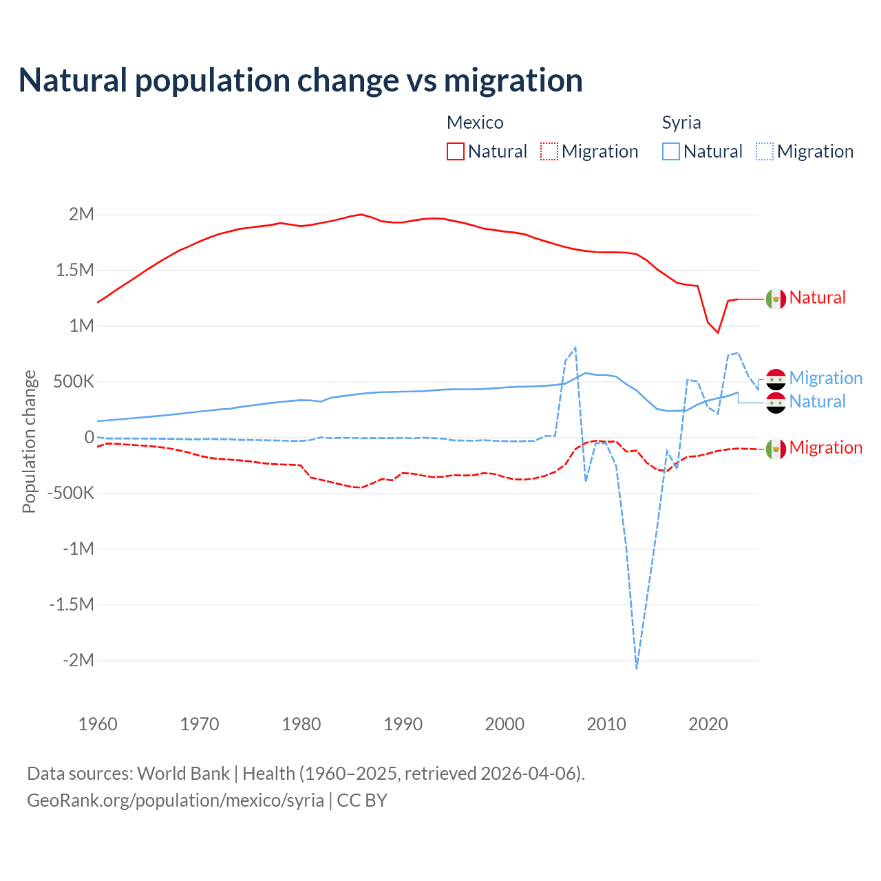 Over the last 10 years, 87.5% of the population change in Mexico is from natural causes (a gain of 13,080,136 people) and 12.5% is from migration (a loss of 1,876,544 people). In Syria 91.3% is from natural causes (a gain of 3,047,621 people) and 8.72% is from migration (a gain of 291,069 people).