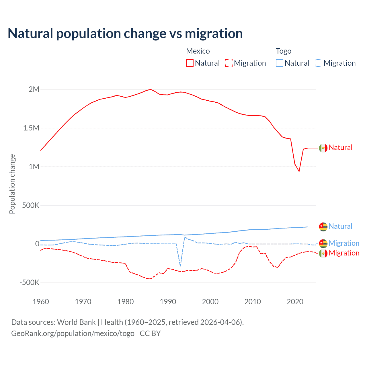 Over the last 10 years, 87.5% of the population change in Mexico is from natural causes (a gain of 13,080,136 people) and 12.5% is from migration (a loss of 1,876,544 people). In Togo 99.1% is from natural causes (a gain of 2,052,115 people) and 0.86% is from migration (a loss of 17,852 people).