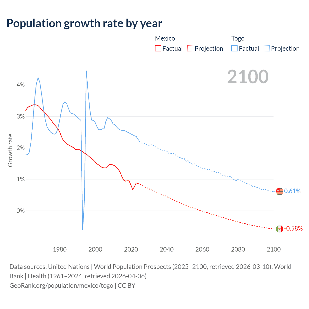 - For the last 10 years, Mexico has had an average growth rate of +0.92% per year vs +2.46% in Togo.