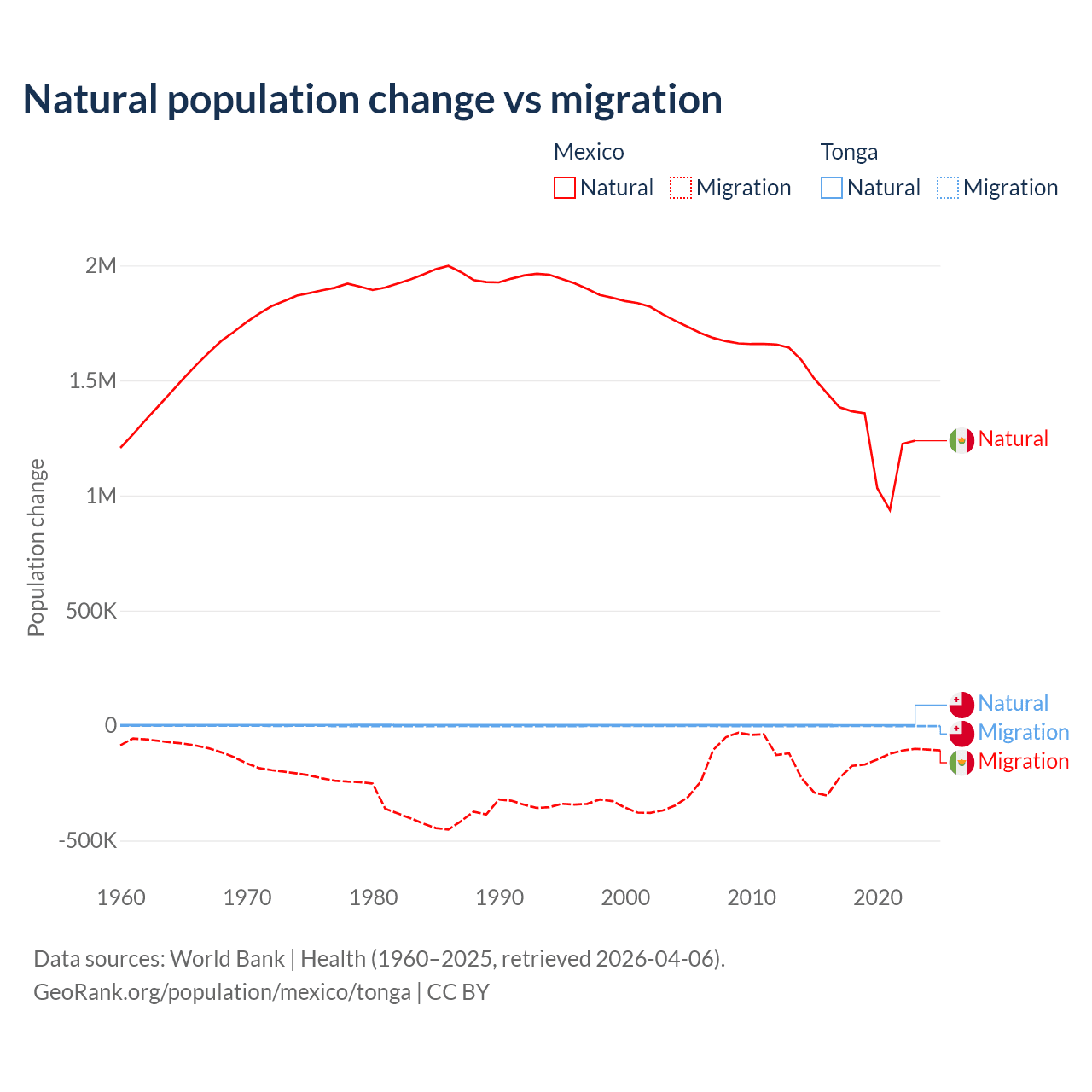 Over the last 10 years, 87.5% of the population change in Mexico is from natural causes (a gain of 13,080,136 people) and 12.5% is from migration (a loss of 1,876,544 people). In Tonga 46.9% is from natural causes (a gain of 18,919 people) and 53.1% is from migration (a loss of 21,384 people).