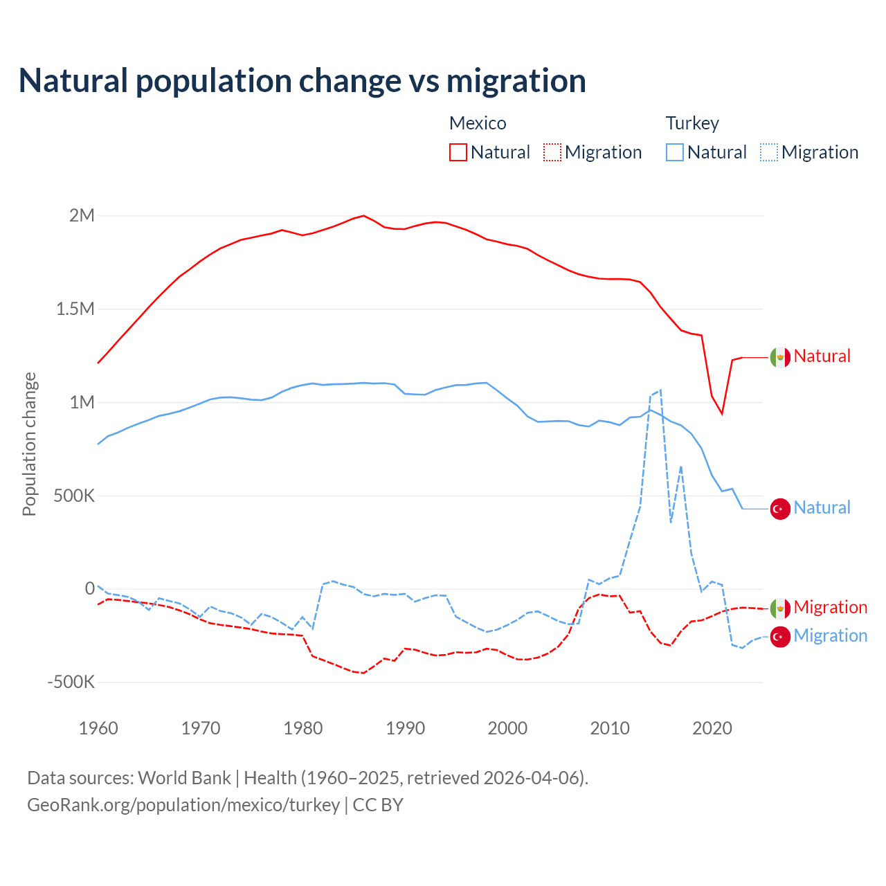 Over the last 10 years, 87.5% of the population change in Mexico is from natural causes (a gain of 13,080,136 people) and 12.5% is from migration (a loss of 1,876,544 people). In Turkey 73% is from natural causes (a gain of 7,333,352 people) and 27% is from migration (a gain of 2,718,916 people).
