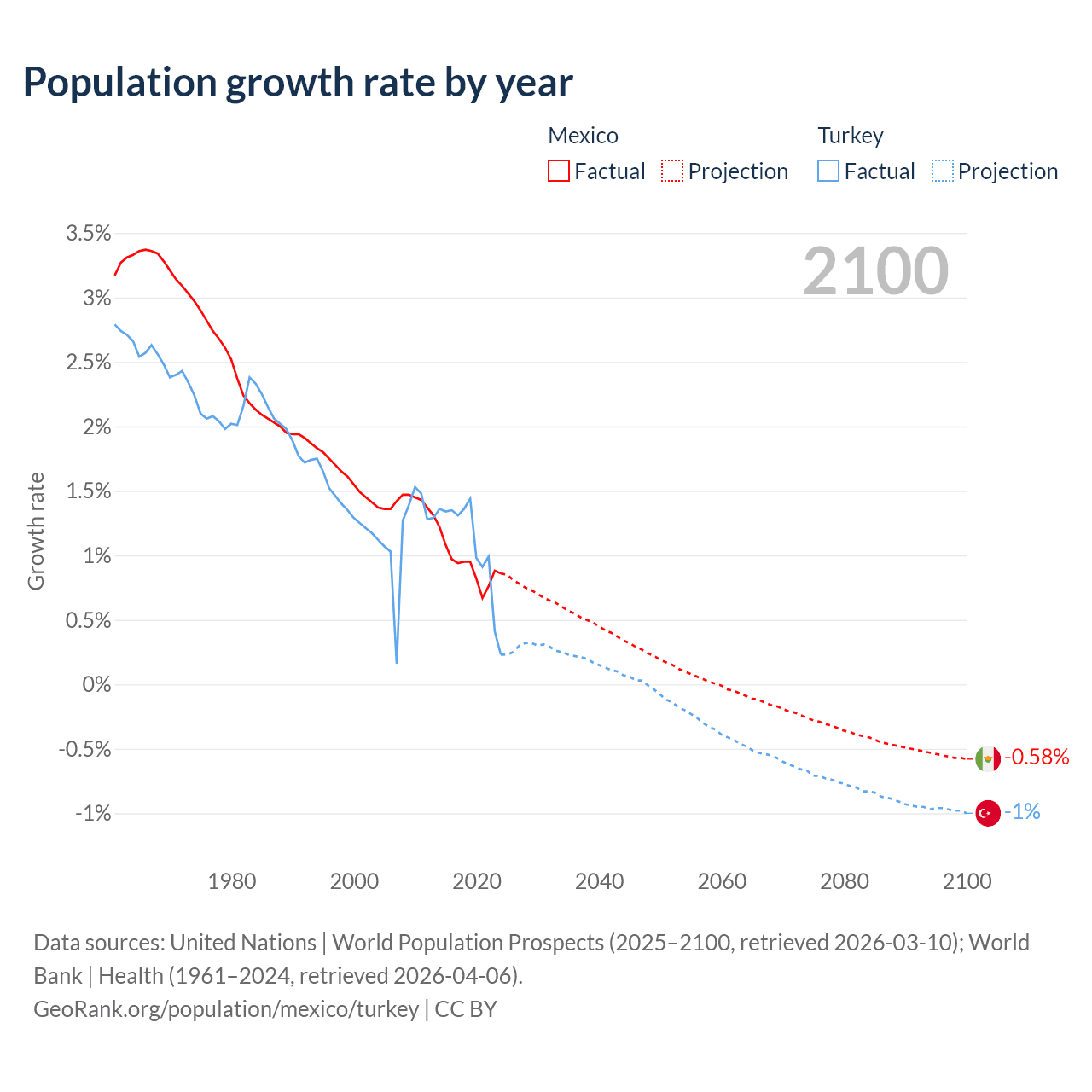 - For the last 10 years, Mexico has had an average growth rate of +0.92% per year vs +1.06% in Turkey.
