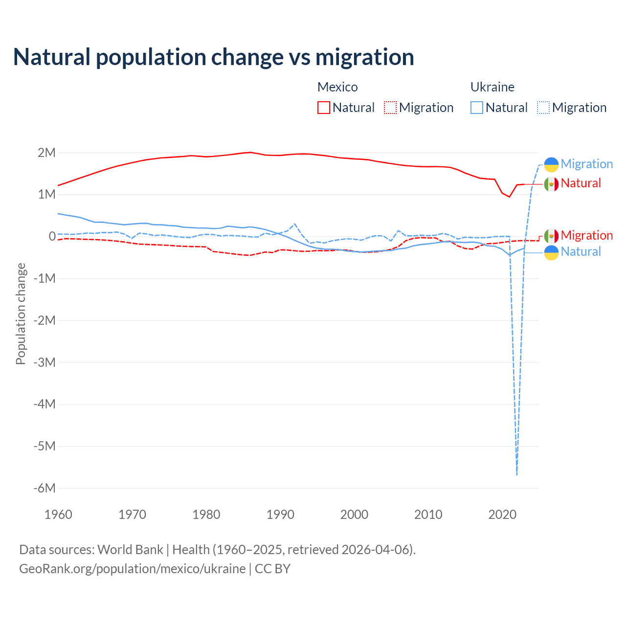 Over the last 10 years, 87.5% of the population change in Mexico is from natural causes (a gain of 13,080,136 people) and 12.5% is from migration (a loss of 1,876,544 people). In Ukraine 28.2% is from natural causes (a loss of 2,435,153 people) and 71.8% is from migration (a loss of 6,198,995 people).