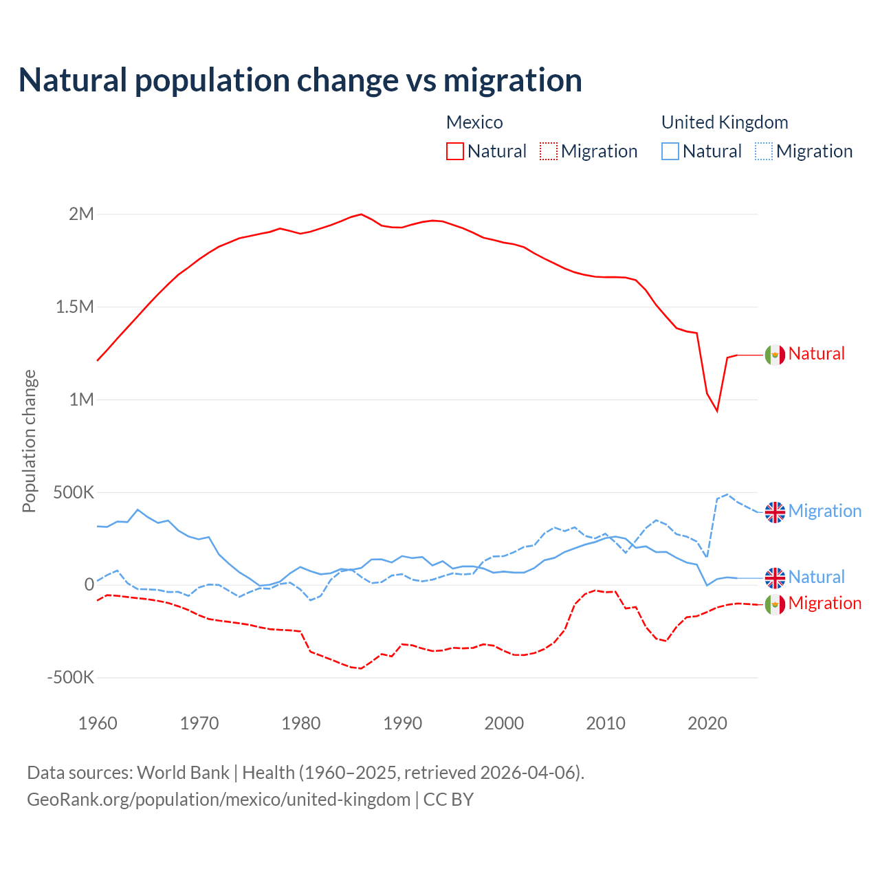 Over the last 10 years, 87.5% of the population change in Mexico is from natural causes (a gain of 13,080,136 people) and 12.5% is from migration (a loss of 1,876,544 people). In the United Kingdom 23.9% is from natural causes (a gain of 1,033,129 people) and 76.1% is from migration (a gain of 3,283,101 people).