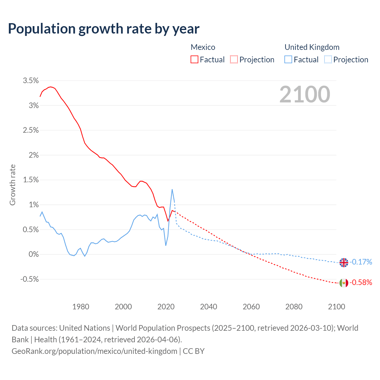 - For the last 10 years, Mexico has had an average growth rate of +0.92% per year vs +0.7% in the United Kingdom.
