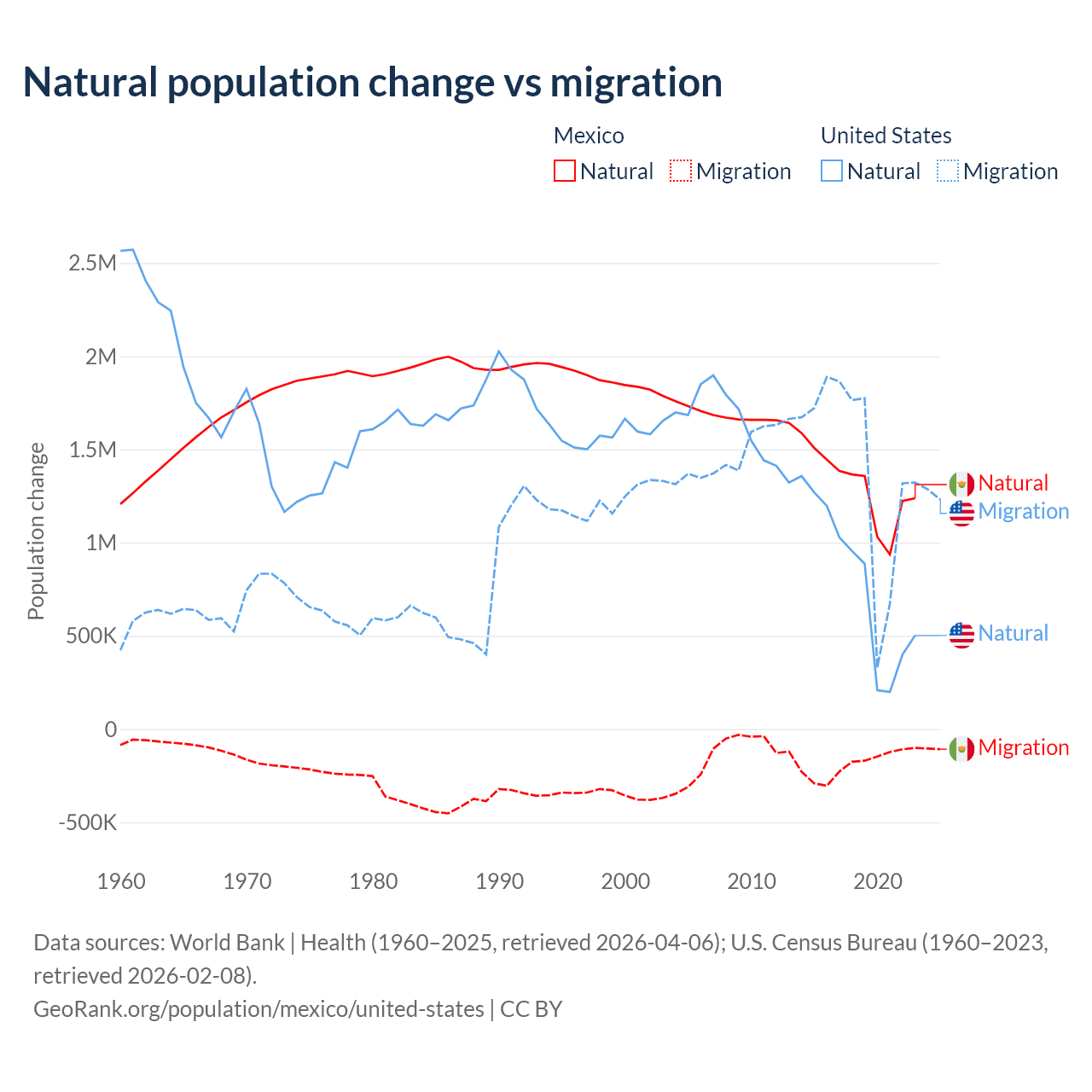 Data sources: World Bank | Health (1960–2025, retrieved 2026-04-06); U.S. Census Bureau (1960–2023, retrieved 2026-02-08).