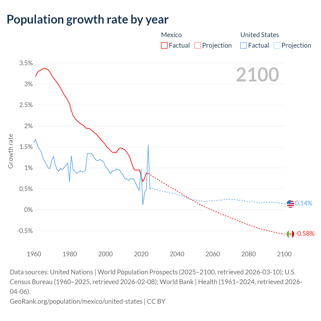 Data sources: World Bank | Health (1960–2024, retrieved 2026-04-06); United Nations | World Population Prospects (1960–2026, retrieved 2026-03-10); U.S. Census Bureau (1960–2025, retrieved 2026-02-08); Central Intelligence Agency (CIA) (2000–2019, retrieved 2026-02-20).