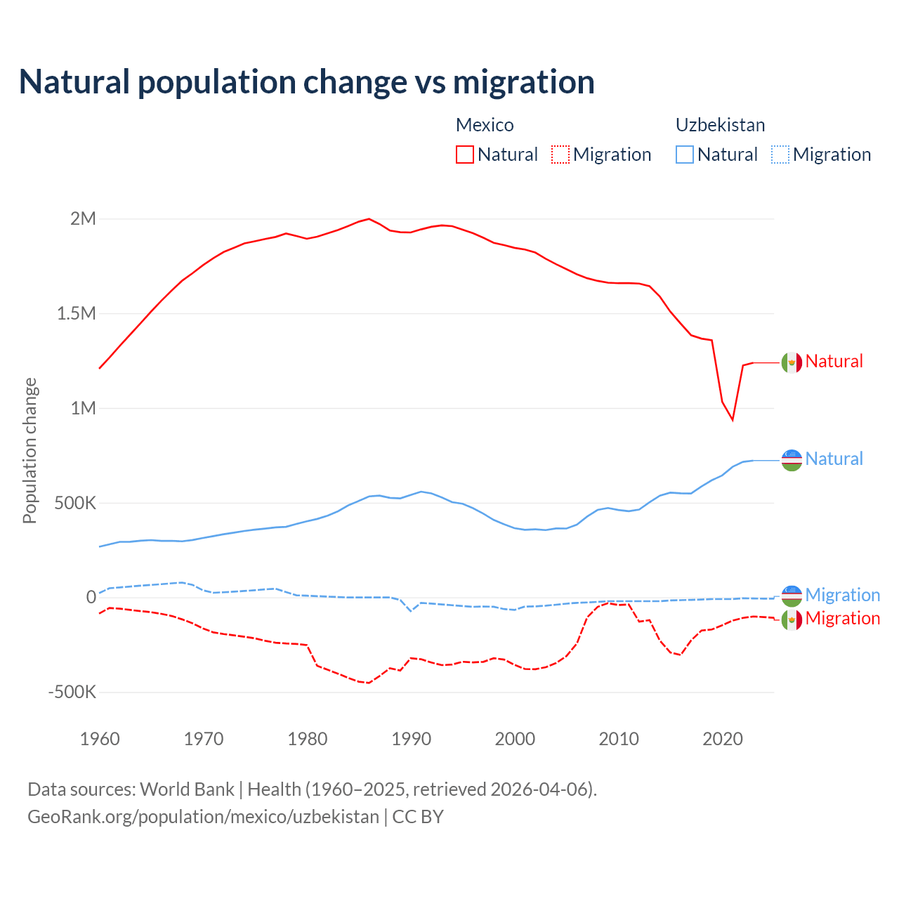 Over the last 10 years, 87.5% of the population change in Mexico is from natural causes (a gain of 13,080,136 people) and 12.5% is from migration (a loss of 1,876,544 people). In Uzbekistan 98.2% is from natural causes (a gain of 6,161,117 people) and 1.84% is from migration (a loss of 115,398 people).