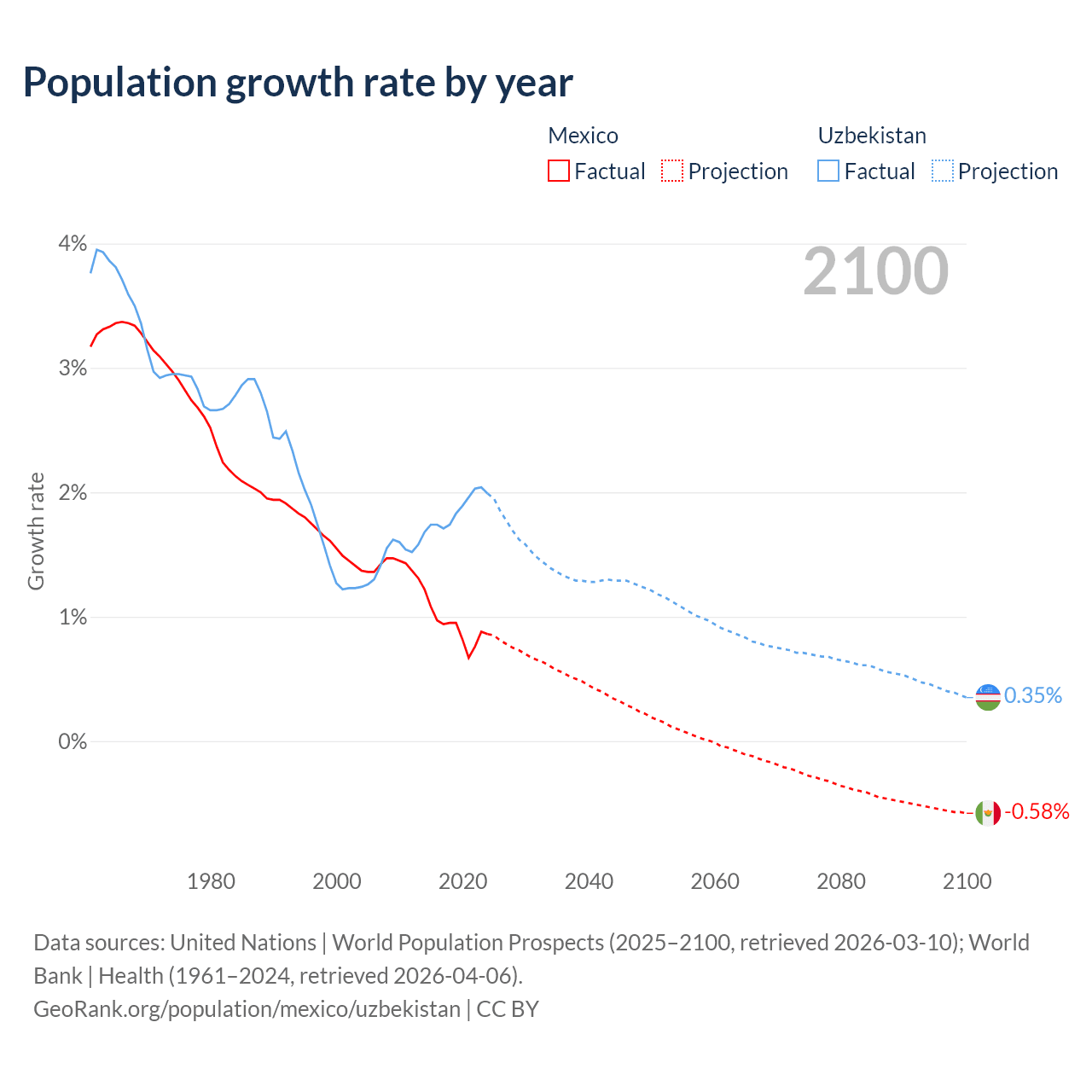 - For the last 10 years, Mexico has had an average growth rate of +0.92% per year vs +1.85% in Uzbekistan.