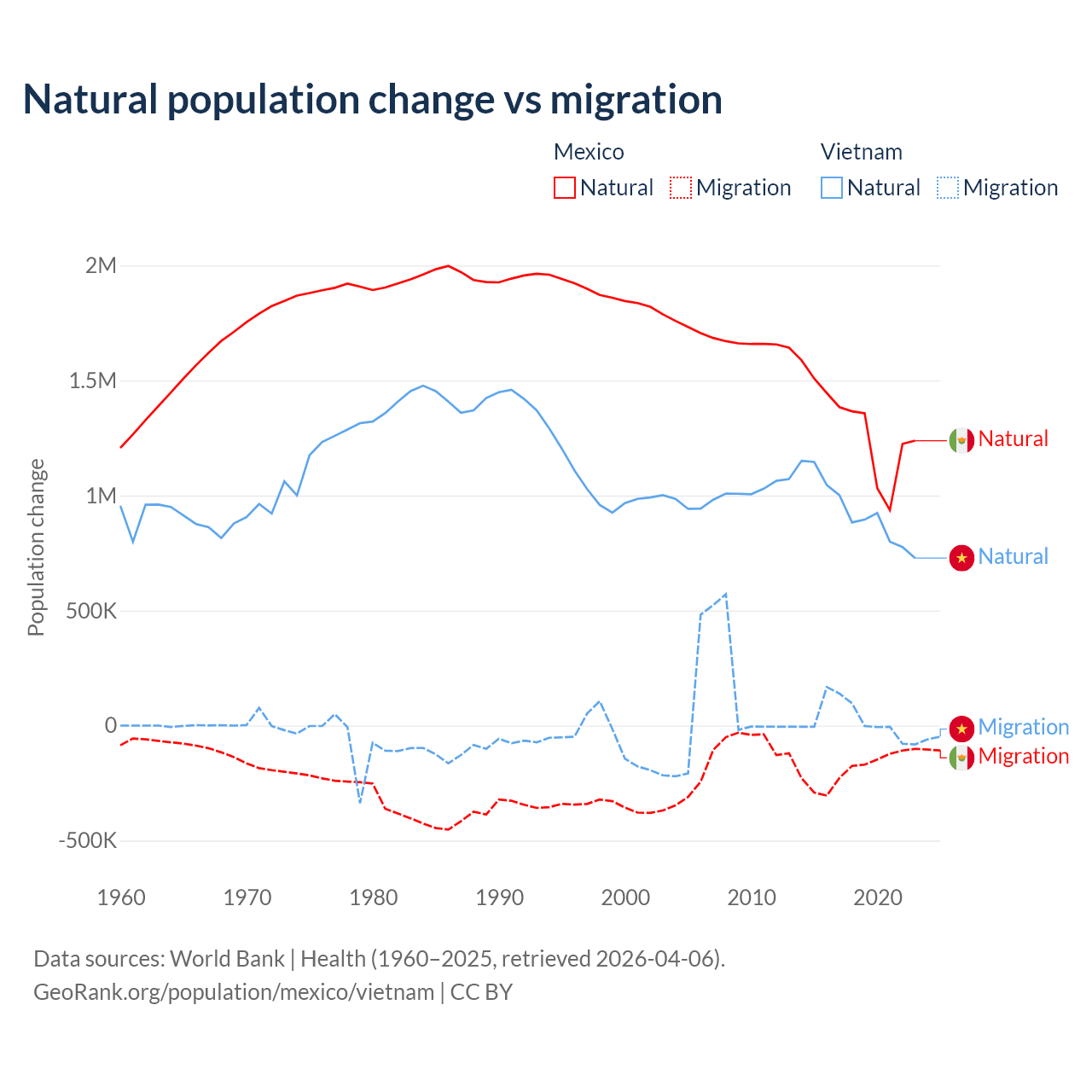 Over the last 10 years, 87.5% of the population change in Mexico is from natural causes (a gain of 13,080,136 people) and 12.5% is from migration (a loss of 1,876,544 people). In Vietnam 97.7% is from natural causes (a gain of 9,349,756 people) and 2.29% is from migration (a gain of 219,073 people).