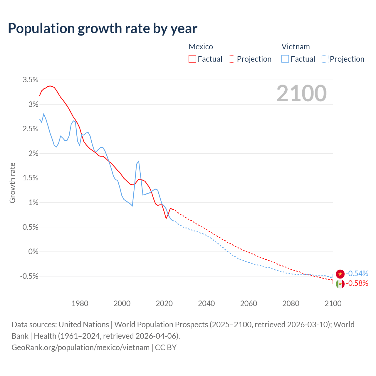 - For the last 10 years, Mexico has had an average growth rate of +0.92% per year vs +0.99% in Vietnam.