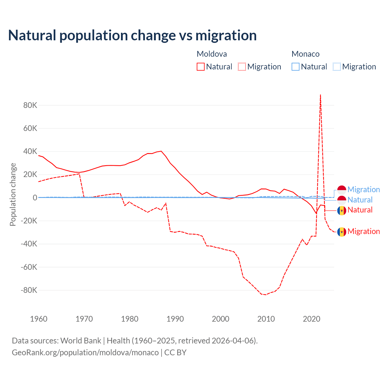 Over the last 10 years, 6.04% of the population change in Moldova is from natural causes (a loss of 19,001 people) and 94% is from migration (a loss of 295,631 people). In Monaco 37.3% is from natural causes (a loss of 4,357 people) and 62.7% is from migration (a gain of 7,333 people).