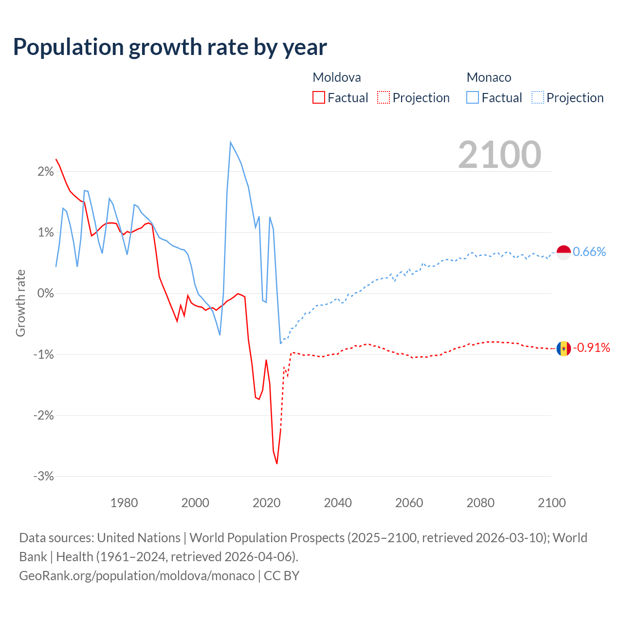 - For the last 10 years, Moldova has had an average growth rate of -1.57% per year vs +0.79% in Monaco.