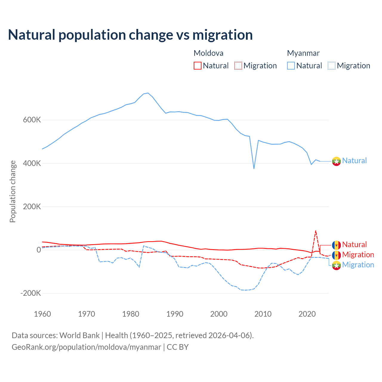 Over the last 10 years, 6.04% of the population change in Moldova is from natural causes (a loss of 19,001 people) and 94% is from migration (a loss of 295,631 people). In Myanmar 86% is from natural causes (a gain of 4,594,615 people) and 14% is from migration (a loss of 749,272 people).