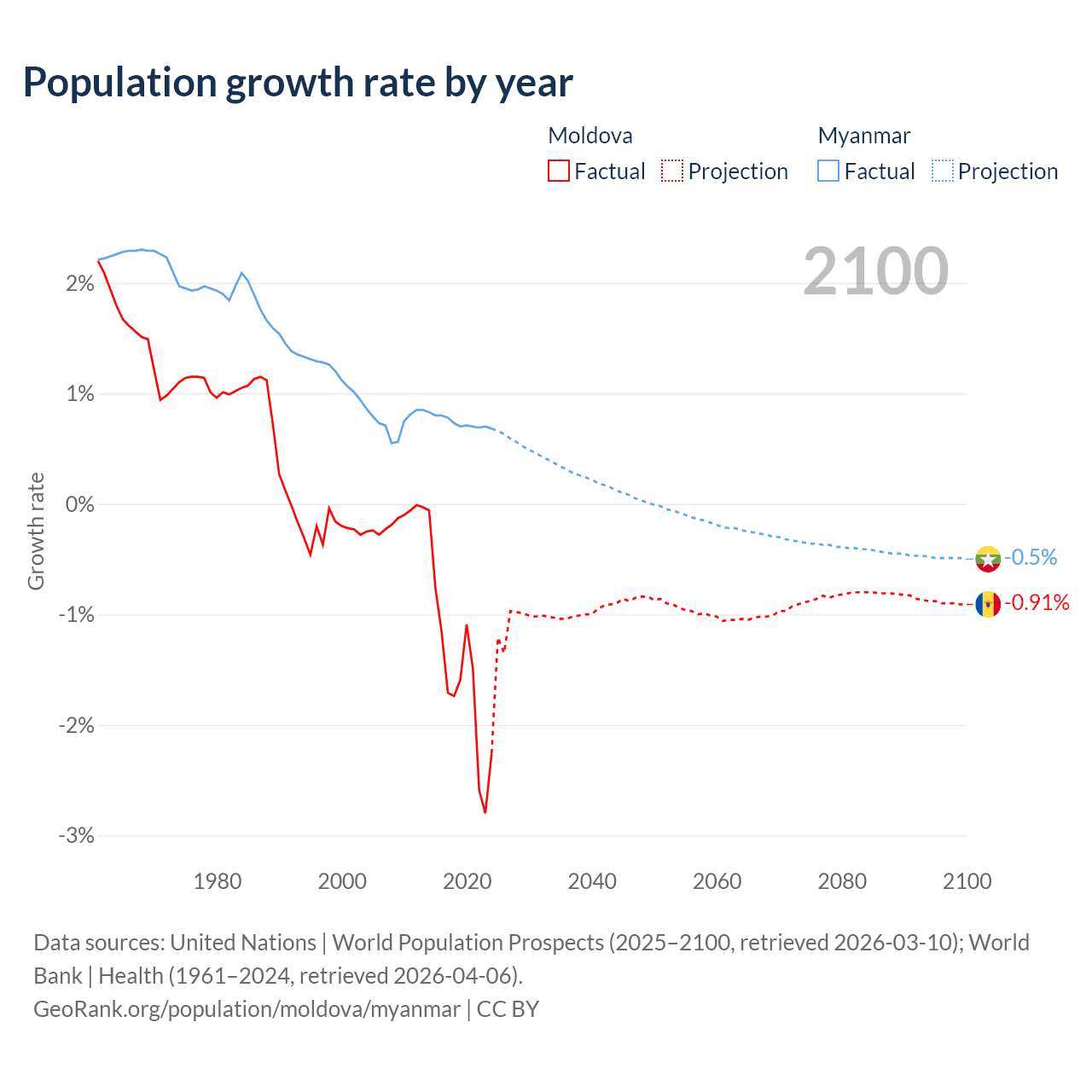 - For the last 10 years, Moldova has had an average growth rate of -1.57% per year vs +0.74% in Myanmar.