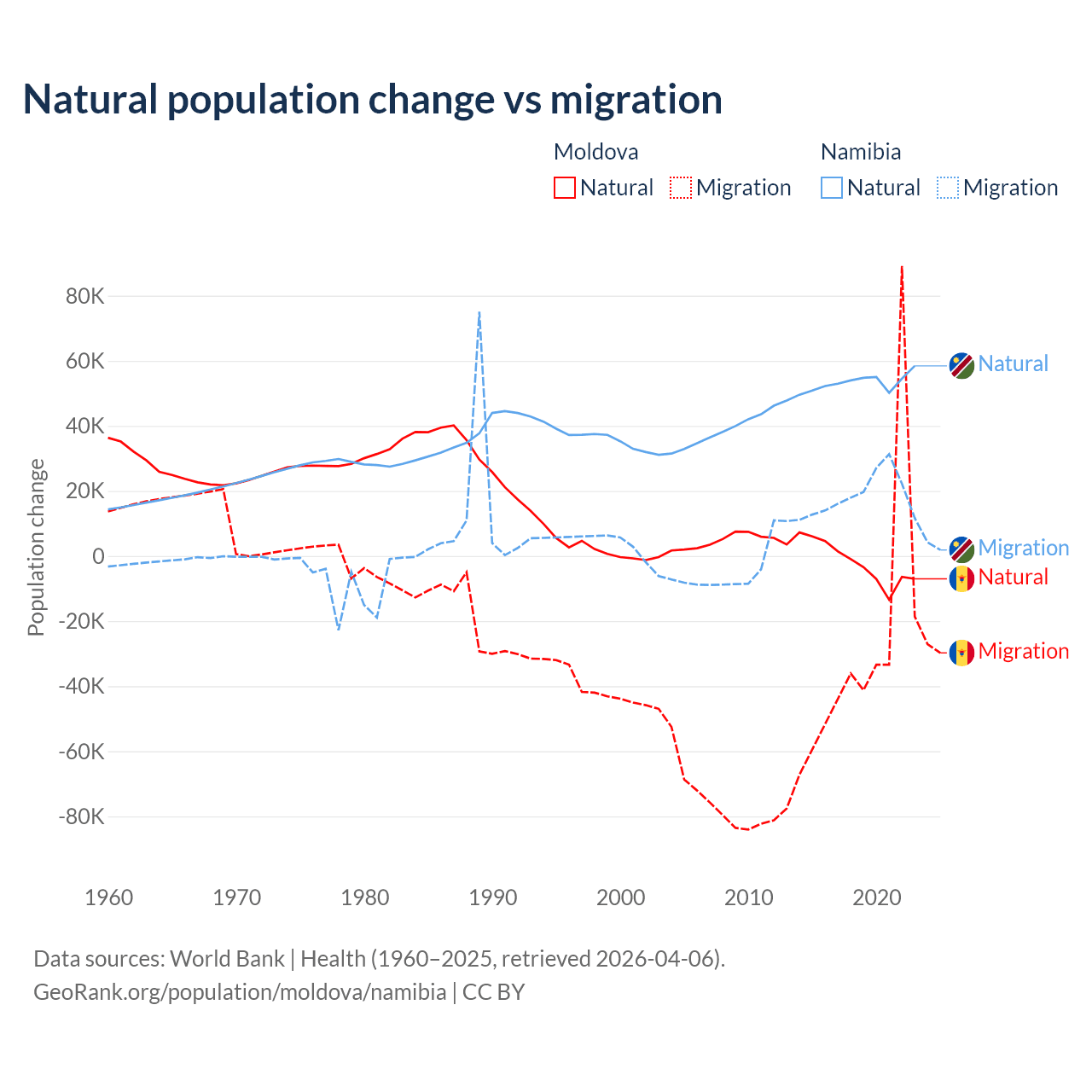 Over the last 10 years, 6.04% of the population change in Moldova is from natural causes (a loss of 19,001 people) and 94% is from migration (a loss of 295,631 people). In Namibia 74.3% is from natural causes (a gain of 532,532 people) and 25.7% is from migration (a gain of 183,837 people).