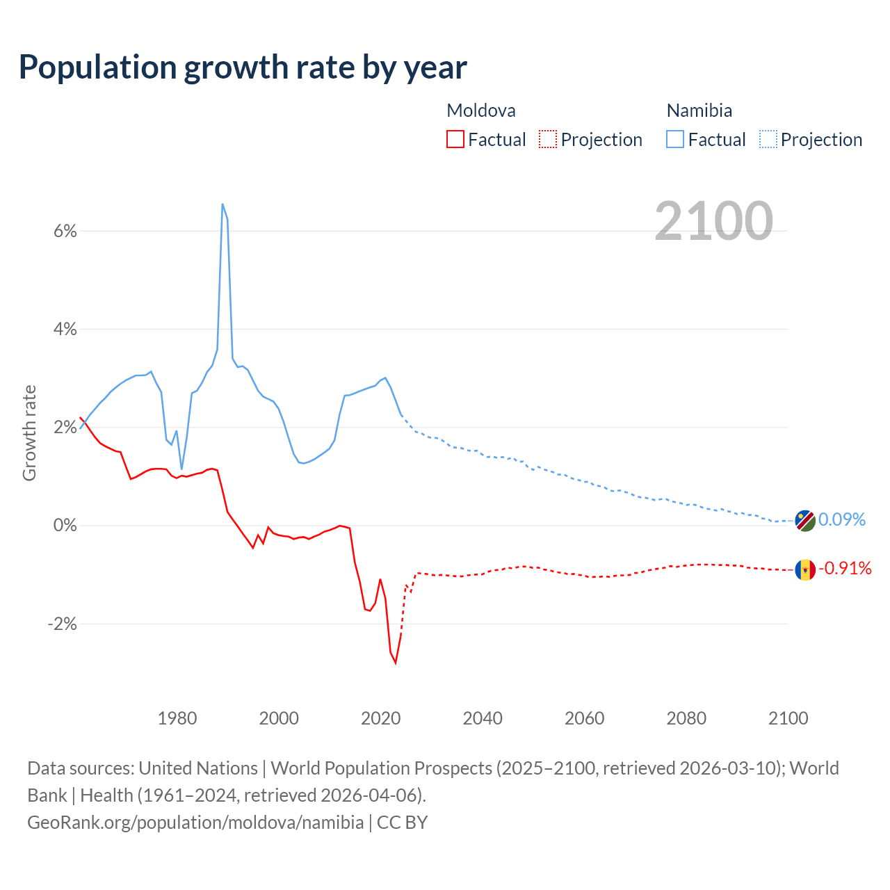 - For the last 10 years, Moldova has had an average growth rate of -1.57% per year vs +2.73% in Namibia.