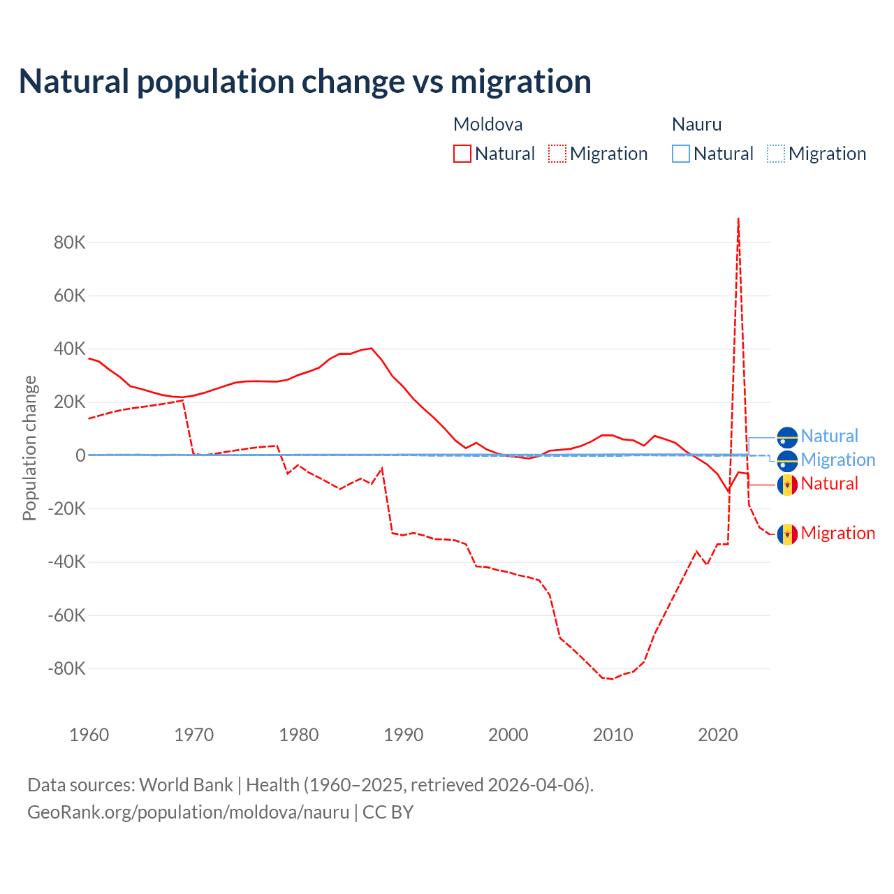 Over the last 10 years, 6.04% of the population change in Moldova is from natural causes (a loss of 19,001 people) and 94% is from migration (a loss of 295,631 people). In Nauru 66.2% is from natural causes (a gain of 2,590 people) and 33.8% is from migration (a loss of 1,320 people).