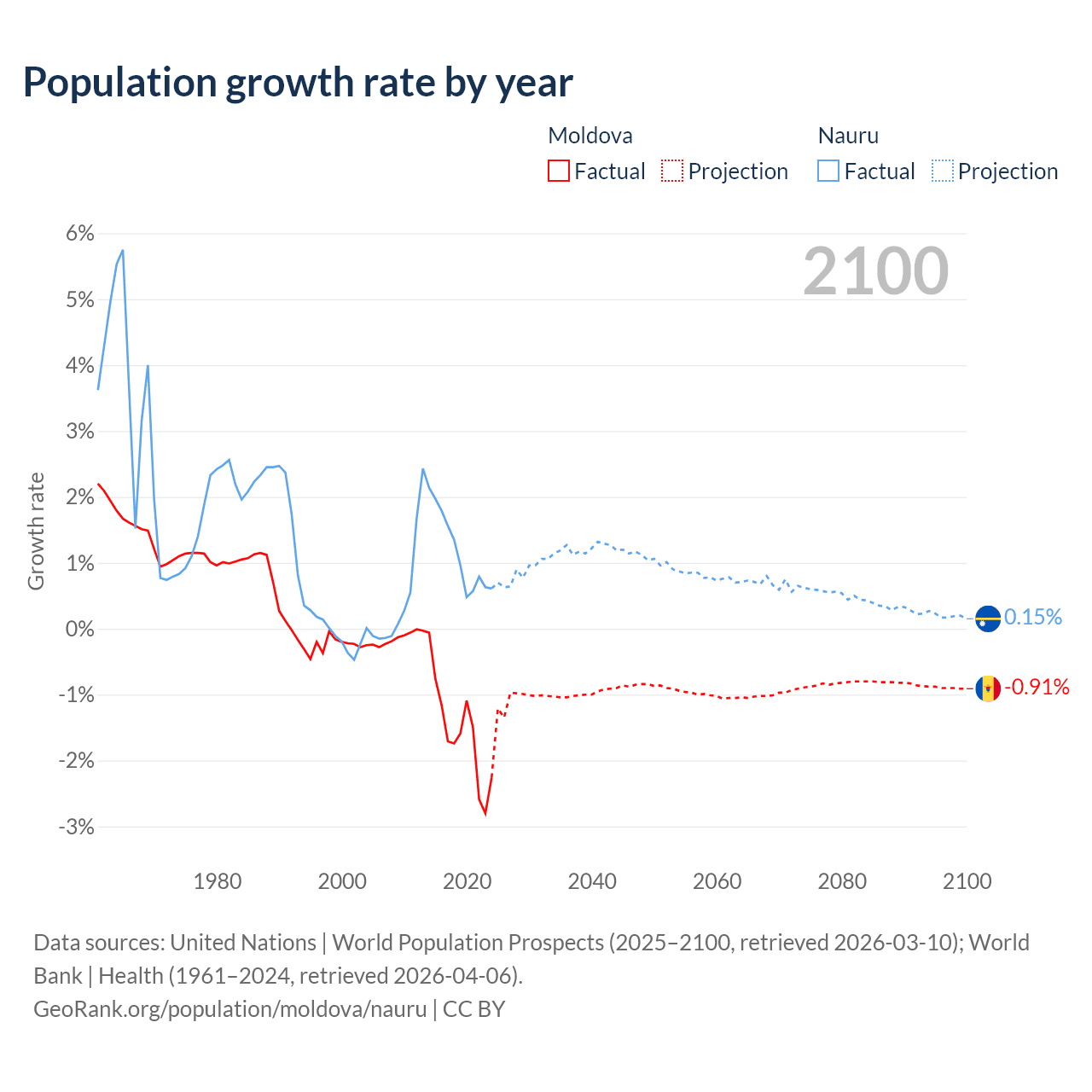 - For the last 10 years, Moldova has had an average growth rate of -1.57% per year vs +1.17% in Nauru.