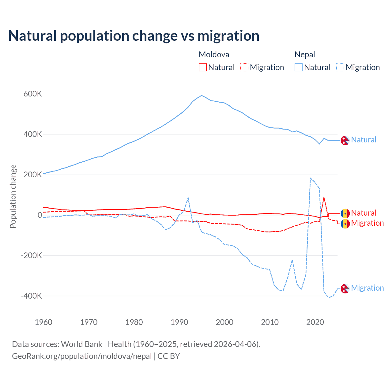 Over the last 10 years, 6.04% of the population change in Moldova is from natural causes (a loss of 19,001 people) and 94% is from migration (a loss of 295,631 people). In Nepal 67.9% is from natural causes (a gain of 3,909,749 people) and 32.1% is from migration (a loss of 1,851,664 people).