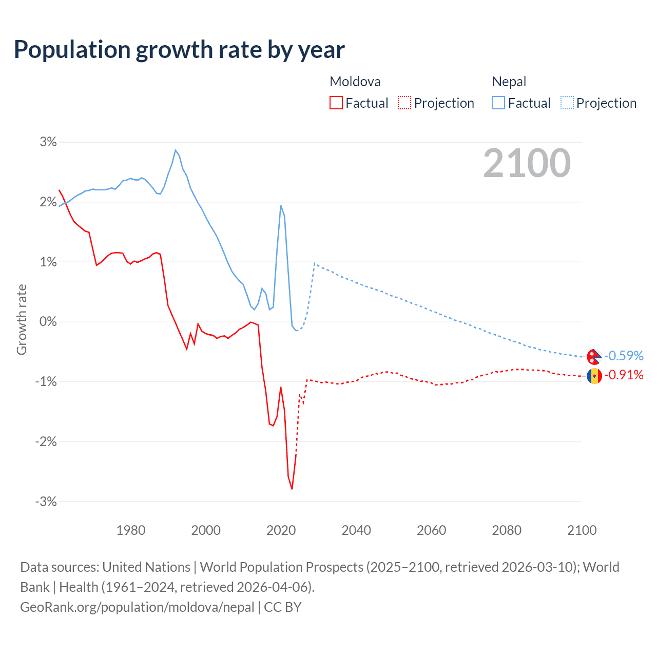 - For the last 10 years, Moldova has had an average growth rate of -1.57% per year vs +0.66% in Nepal.