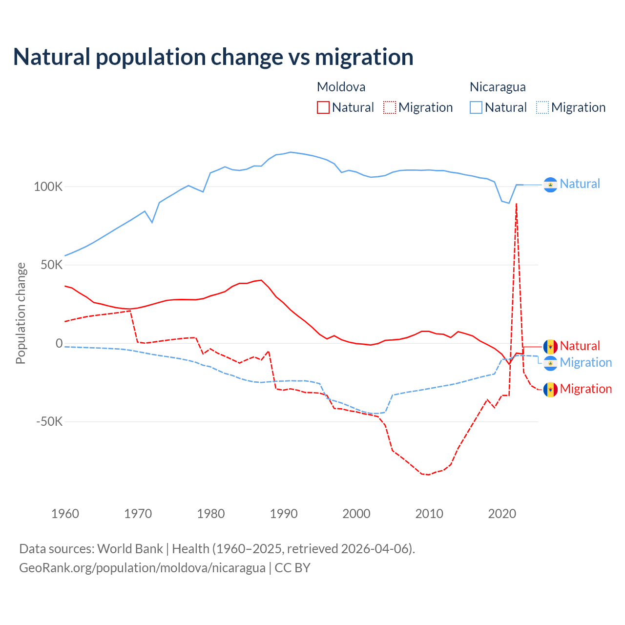 Over the last 10 years, 6.04% of the population change in Moldova is from natural causes (a loss of 19,001 people) and 94% is from migration (a loss of 295,631 people). In Nicaragua 85.5% is from natural causes (a gain of 1,017,084 people) and 14.5% is from migration (a loss of 172,078 people).
