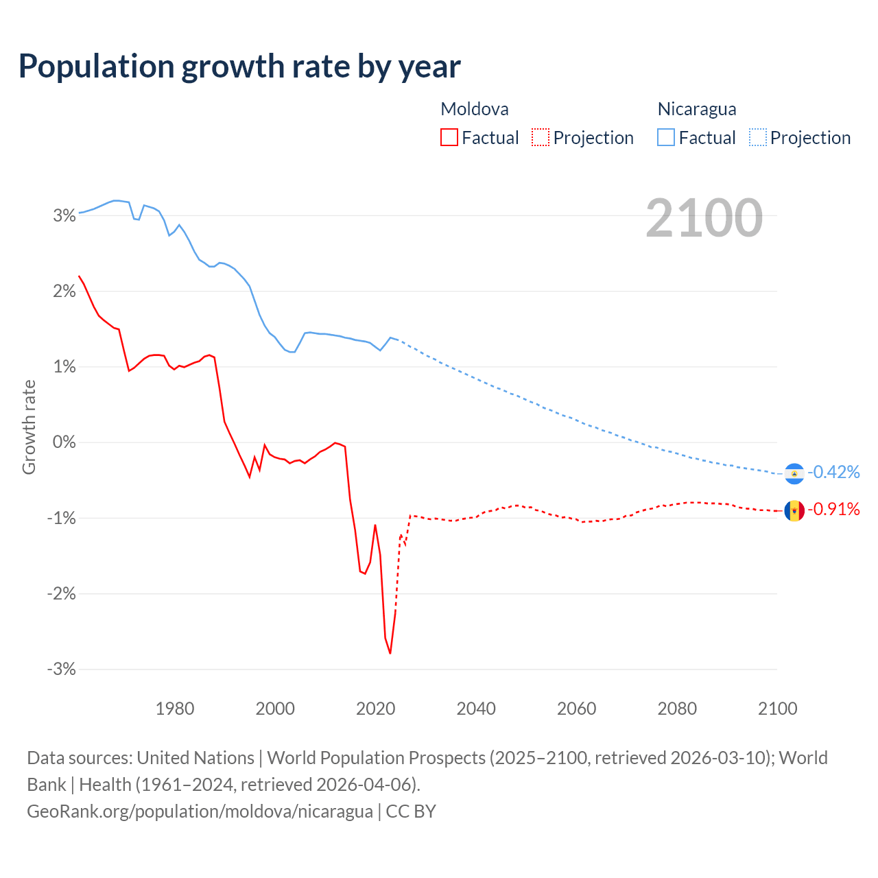 - For the last 10 years, Moldova has had an average growth rate of -1.57% per year vs +1.33% in Nicaragua.