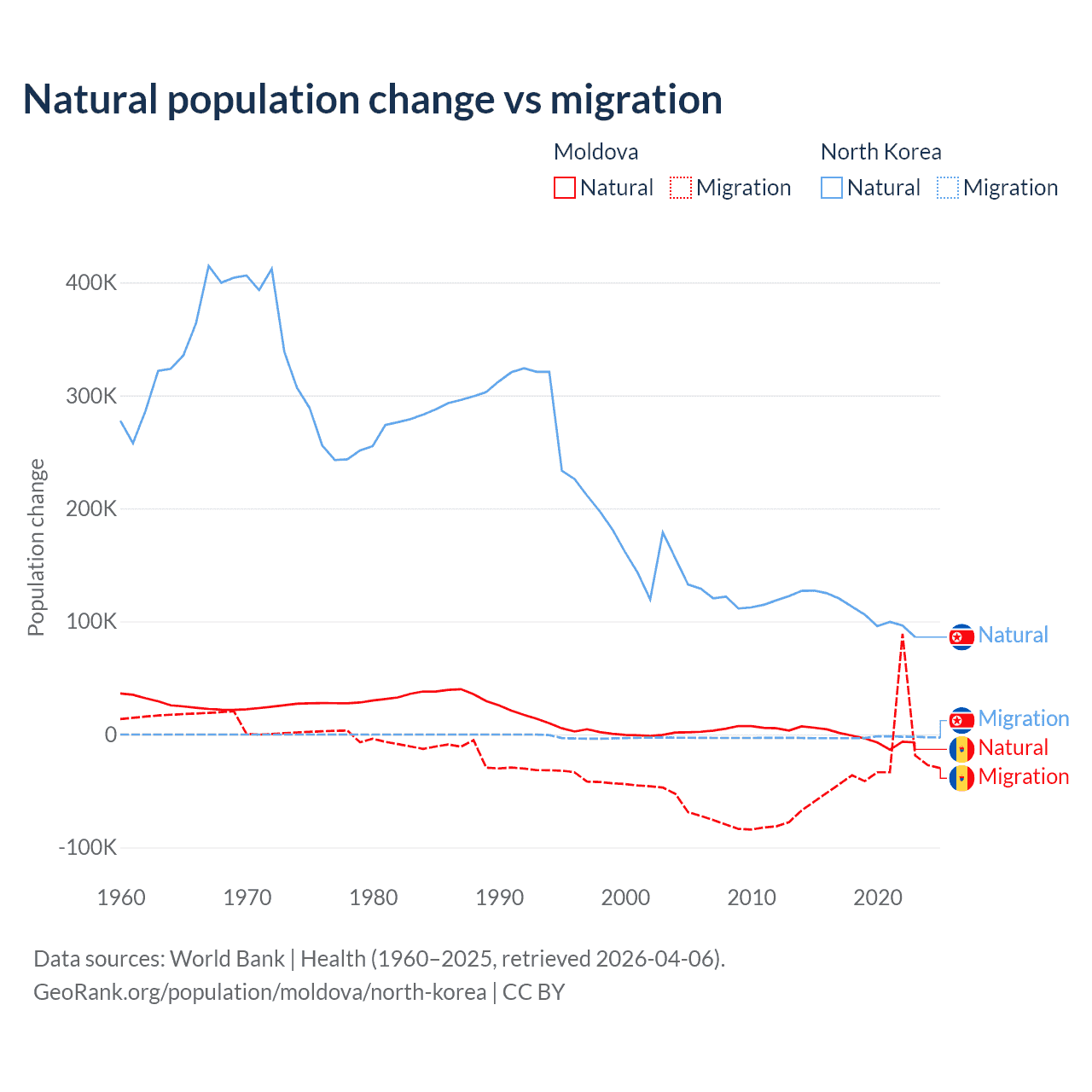 Over the last 10 years, 6.04% of the population change in Moldova is from natural causes (a loss of 19,001 people) and 94% is from migration (a loss of 295,631 people). In North Korea 97.7% is from natural causes (a gain of 1,097,372 people) and 2.33% is from migration (a loss of 26,227 people).