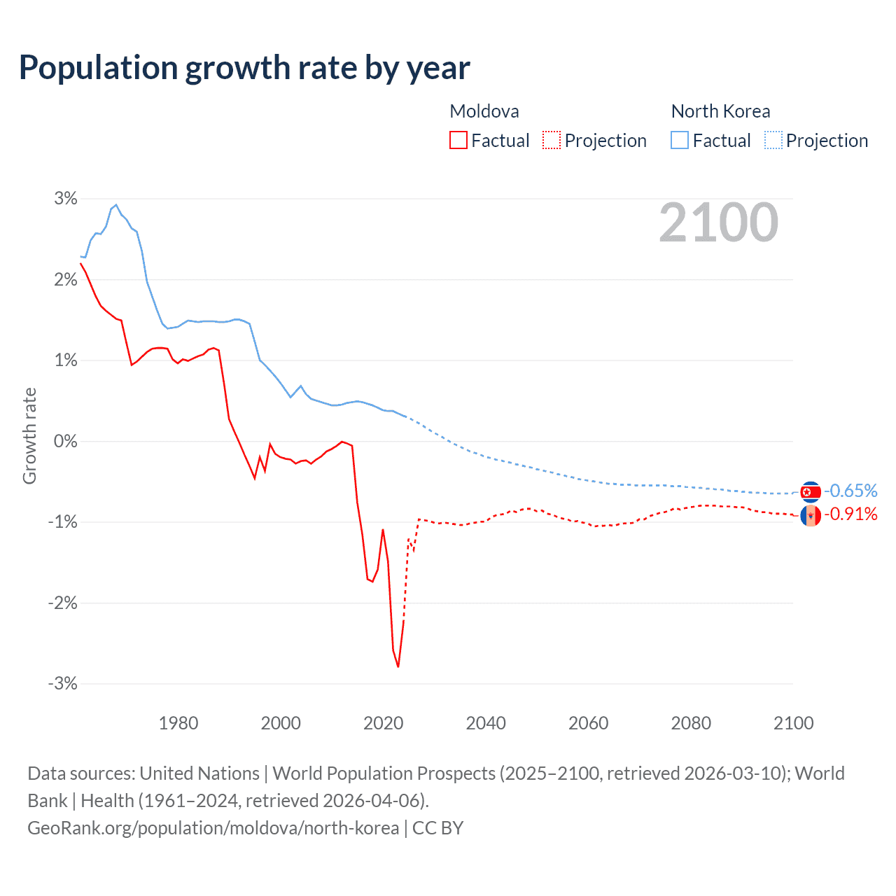 - For the last 10 years, Moldova has had an average growth rate of -1.57% per year vs +0.41% in North Korea.
