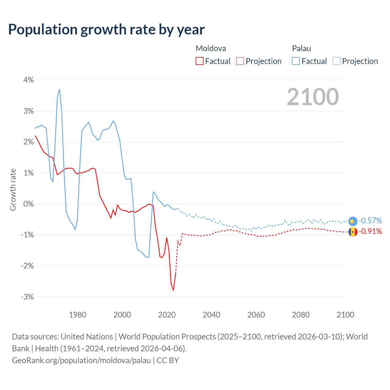 - For the last 10 years, Moldova has had an average growth rate of -1.57% per year vs +0.02% in Palau.