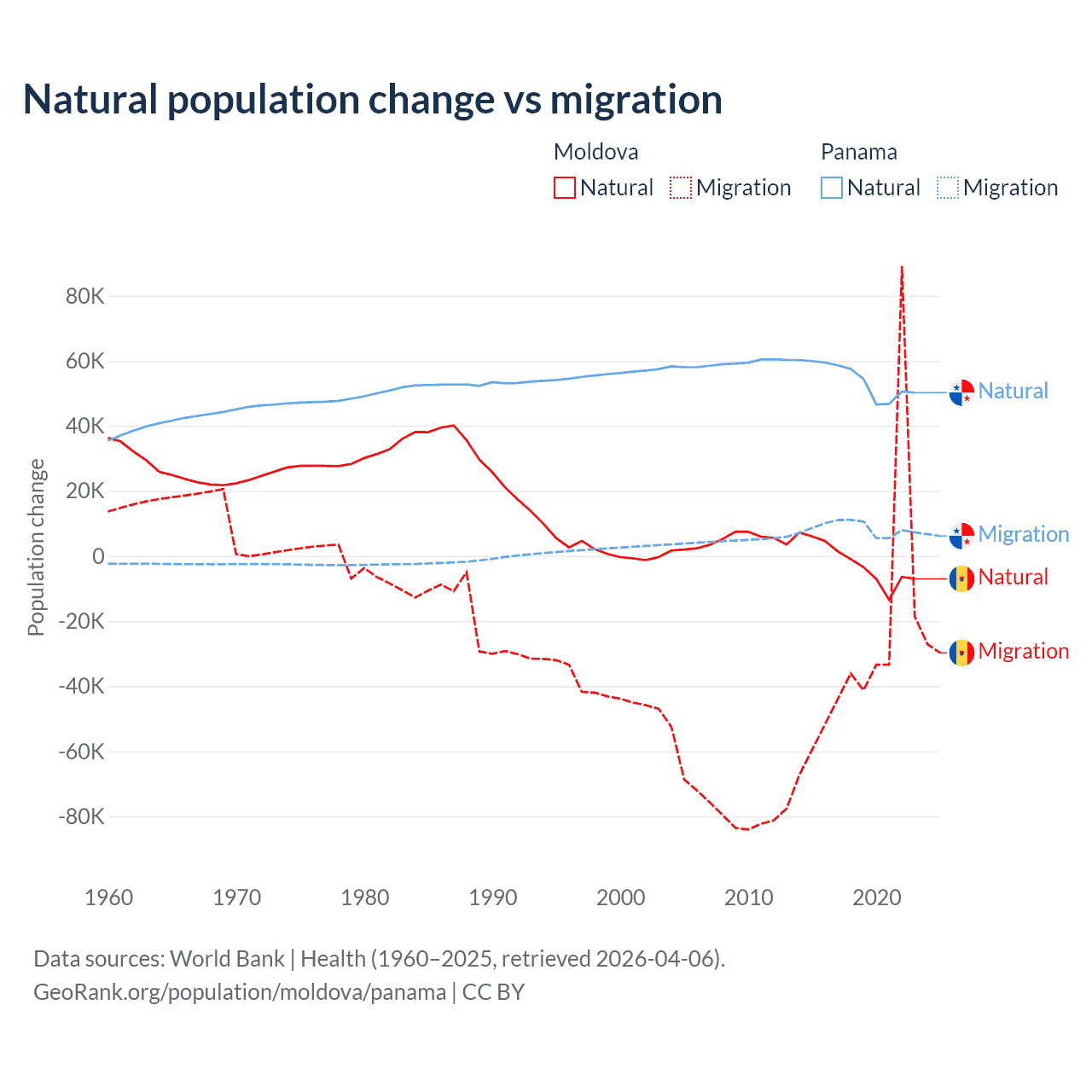 Over the last 10 years, 6.04% of the population change in Moldova is from natural causes (a loss of 19,001 people) and 94% is from migration (a loss of 295,631 people). In Panama 86.5% is from natural causes (a gain of 544,211 people) and 13.5% is from migration (a gain of 84,849 people).