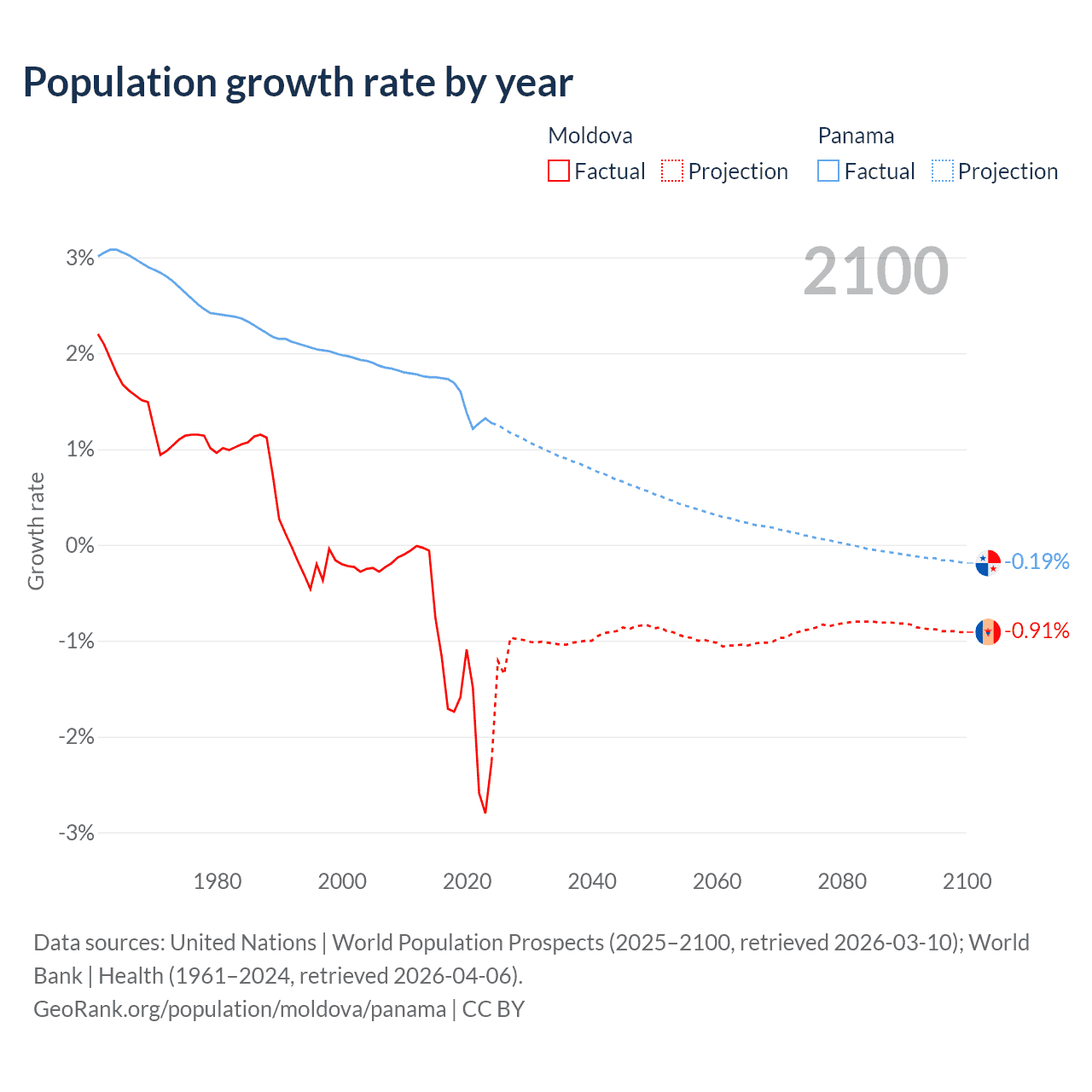 - For the last 10 years, Moldova has had an average growth rate of -1.57% per year vs +1.52% in Panama.