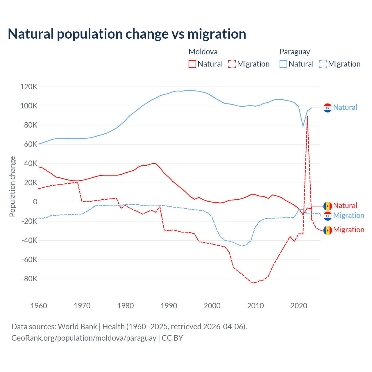 Over the last 10 years, 6.04% of the population change in Moldova is from natural causes (a loss of 19,001 people) and 94% is from migration (a loss of 295,631 people). In Paraguay 87.6% is from natural causes (a gain of 1,002,636 people) and 12.4% is from migration (a loss of 141,377 people).