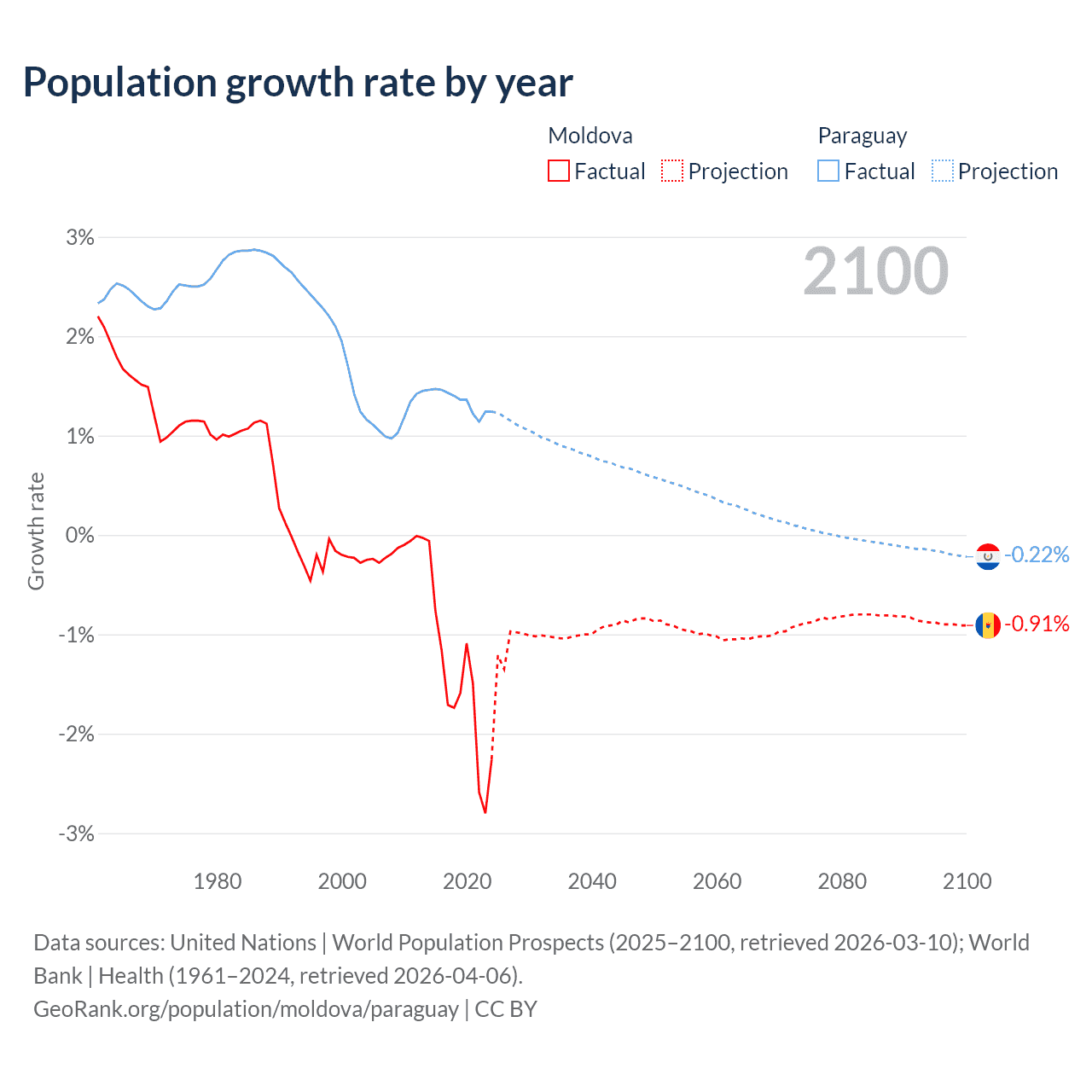 - For the last 10 years, Moldova has had an average growth rate of -1.57% per year vs +1.34% in Paraguay.
