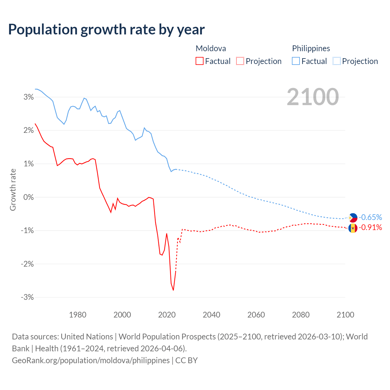 Data sources: World Bank | Health (1960–2024, retrieved 2026-04-06); United Nations | World Population Prospects (1960–2026, retrieved 2026-03-10); U.S. Census Bureau (1960–2025, retrieved 2026-02-08); Central Intelligence Agency (CIA) (2000–2019, retrieved 2026-02-20).