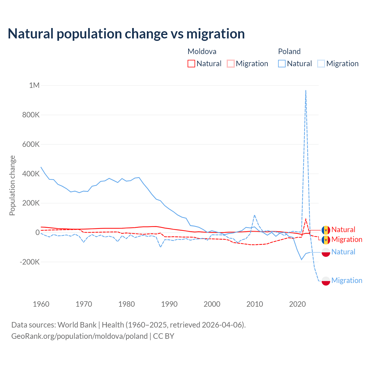 Over the last 10 years, 6.04% of the population change in Moldova is from natural causes (a loss of 19,001 people) and 94% is from migration (a loss of 295,631 people). In Poland 41.4% is from natural causes (a loss of 675,443 people) and 58.6% is from migration (a gain of 955,766 people).